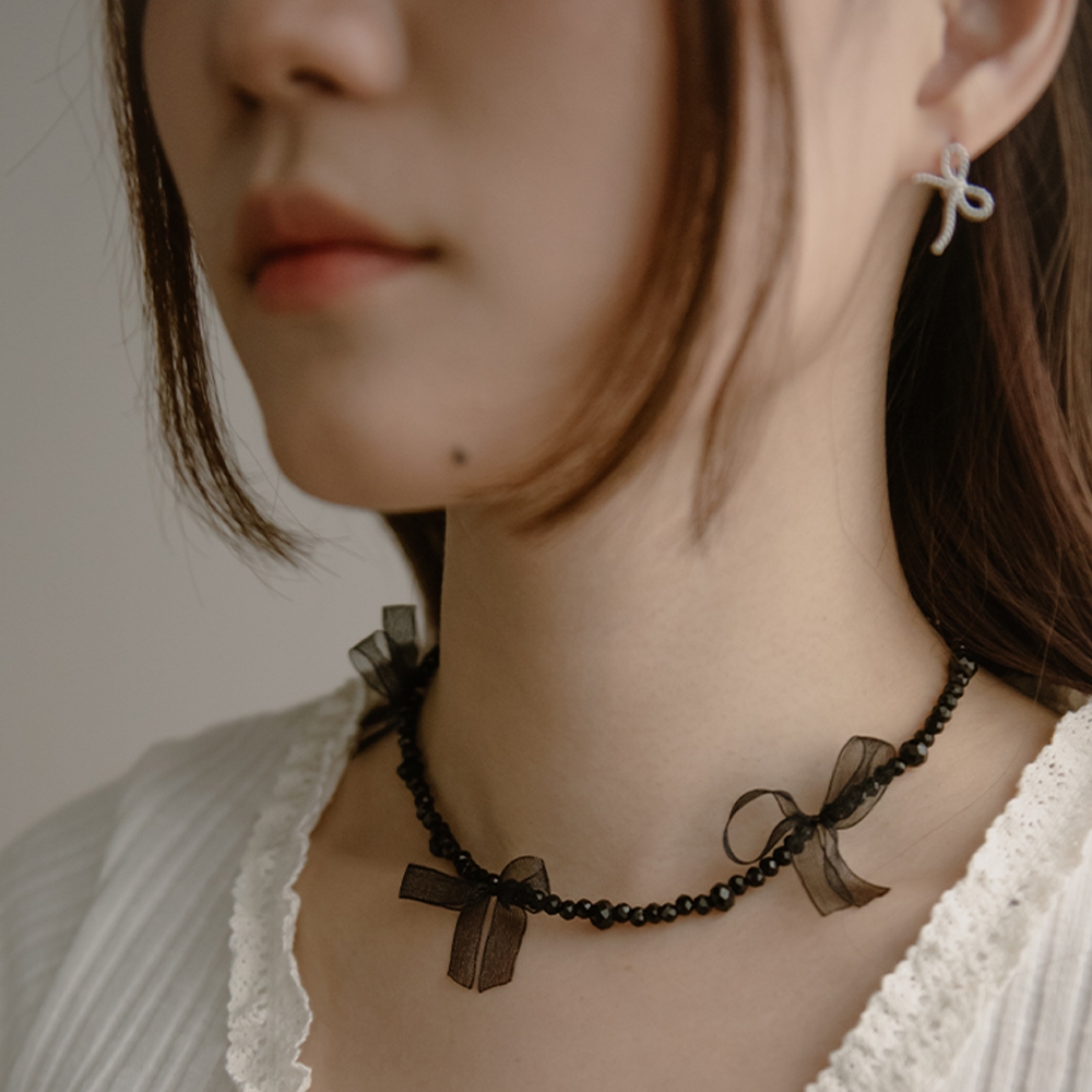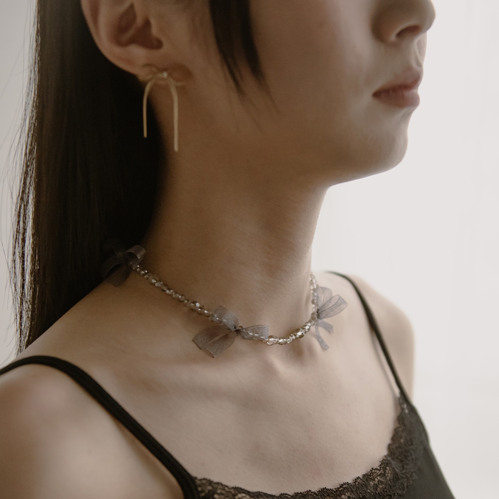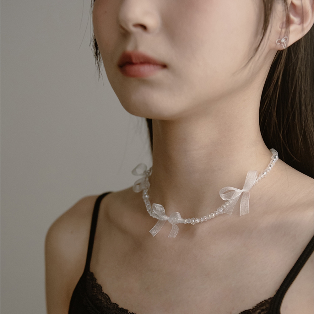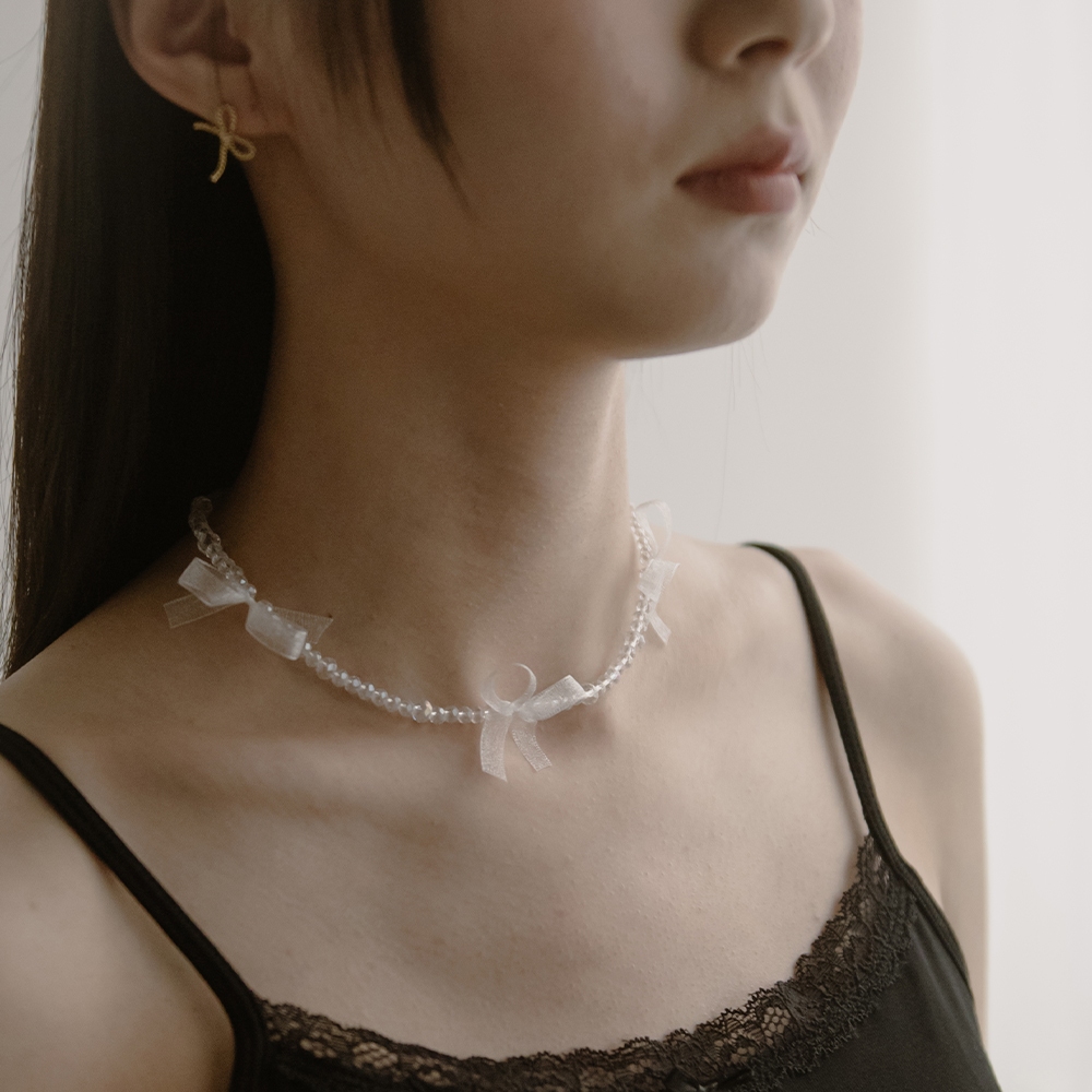 QUEENSHOP女裝 正韓 網紗蝴蝶結水晶造型項鍊 三色售 *現+預*【07040364】黑|灰|白QUEENSHOP
