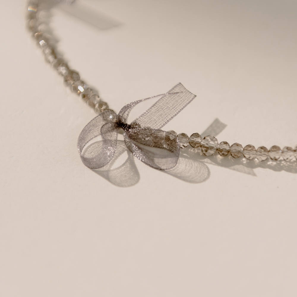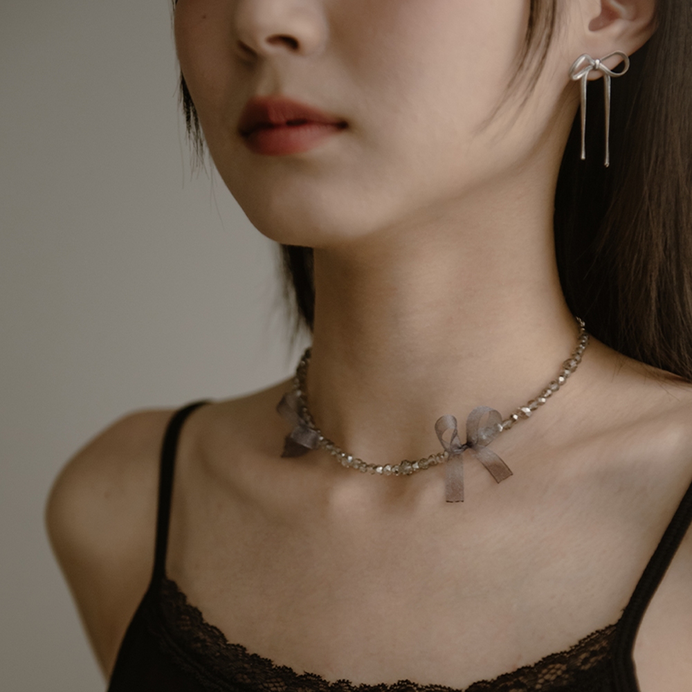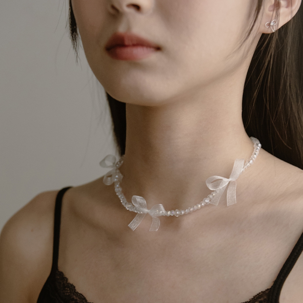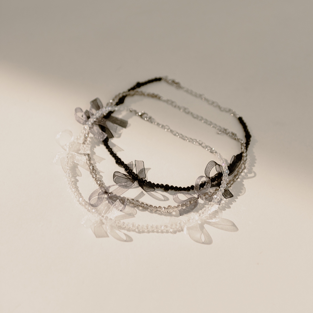 QUEENSHOP女裝 正韓 網紗蝴蝶結水晶造型項鍊 三色售 *現+預*【07040364】黑|灰|白QUEENSHOP