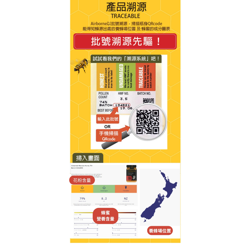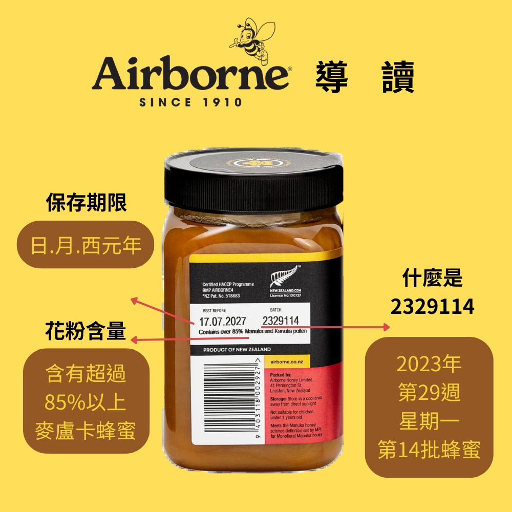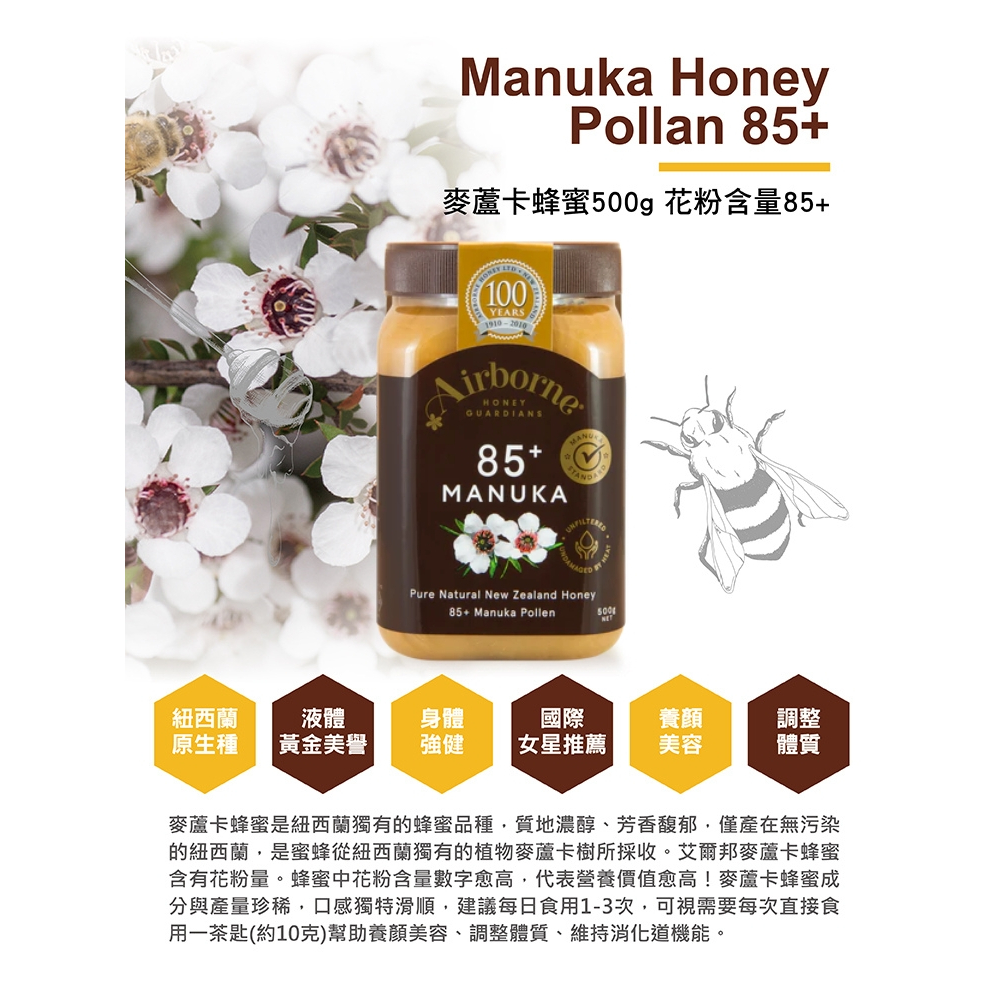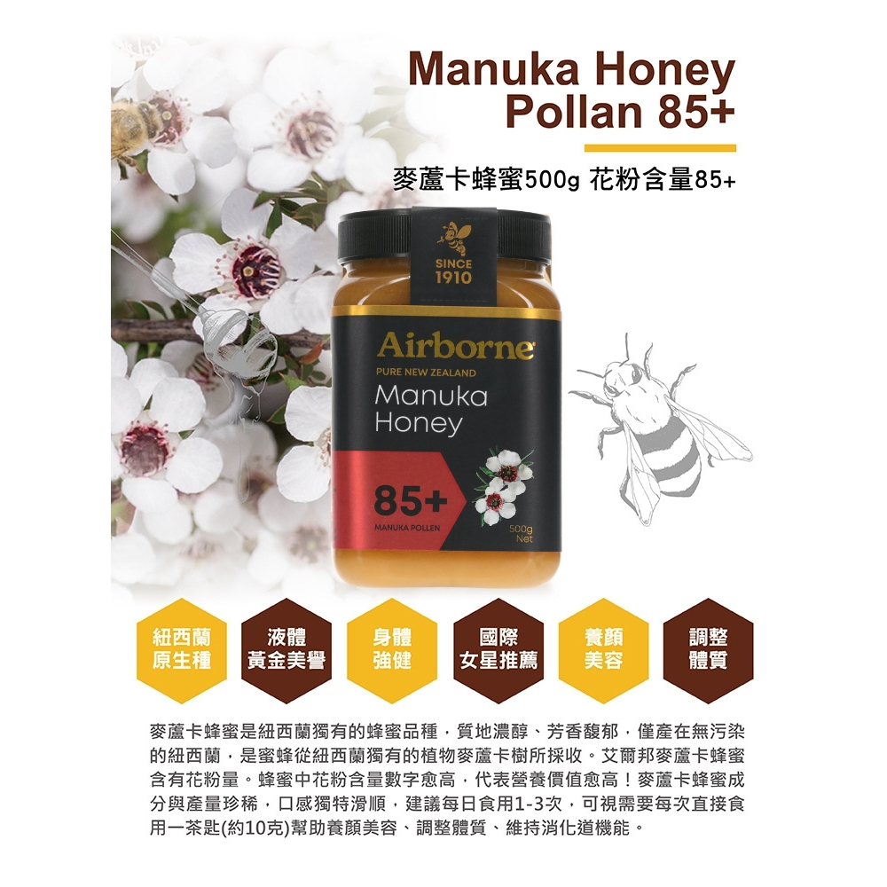 Airborne 艾爾邦 紐西蘭 蜂蜜 500克 花粉含量85+ 調整腸胃道機能85+(新包裝效期:2028/7/12)|85+(舊包裝效期:2025/12/6)|85+(新包裝凹損)Honey & Maple SyrupsMRJ Life慧緻生活 │官方旗艦店