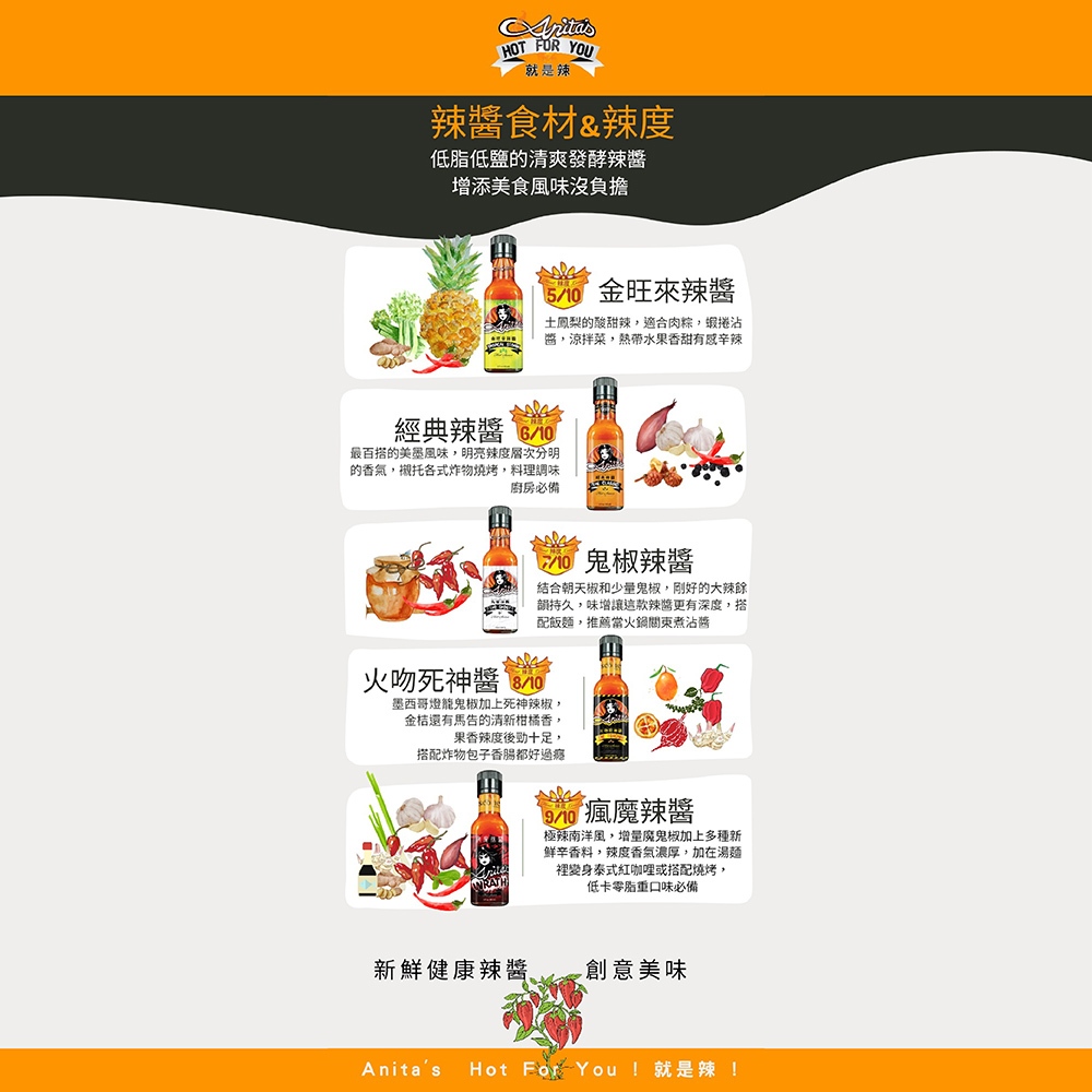 Anita’s 安妮塔辣椒醬 200ml 台東小農 美式辣椒醬 低卡辣椒醬 無麩質 墨西哥風味 迷你瓶辣醬 超辣辣椒醬經典辣醬(五辛素)2026/12/16|金旺來辣醬(純素)2026/12/5|鬼椒辣醬(純素)2026/11/14|火吻死神辣醬(五辛素)2026/11/1|迷你瓶–鬼椒 (純素) 26/11/5|迷你瓶–火吻 (五辛素) 26/10/9|迷你瓶–經典 (五辛素) 26/10/3Seasonings & CondimentsRS睿森嚴選|秋樂富油品