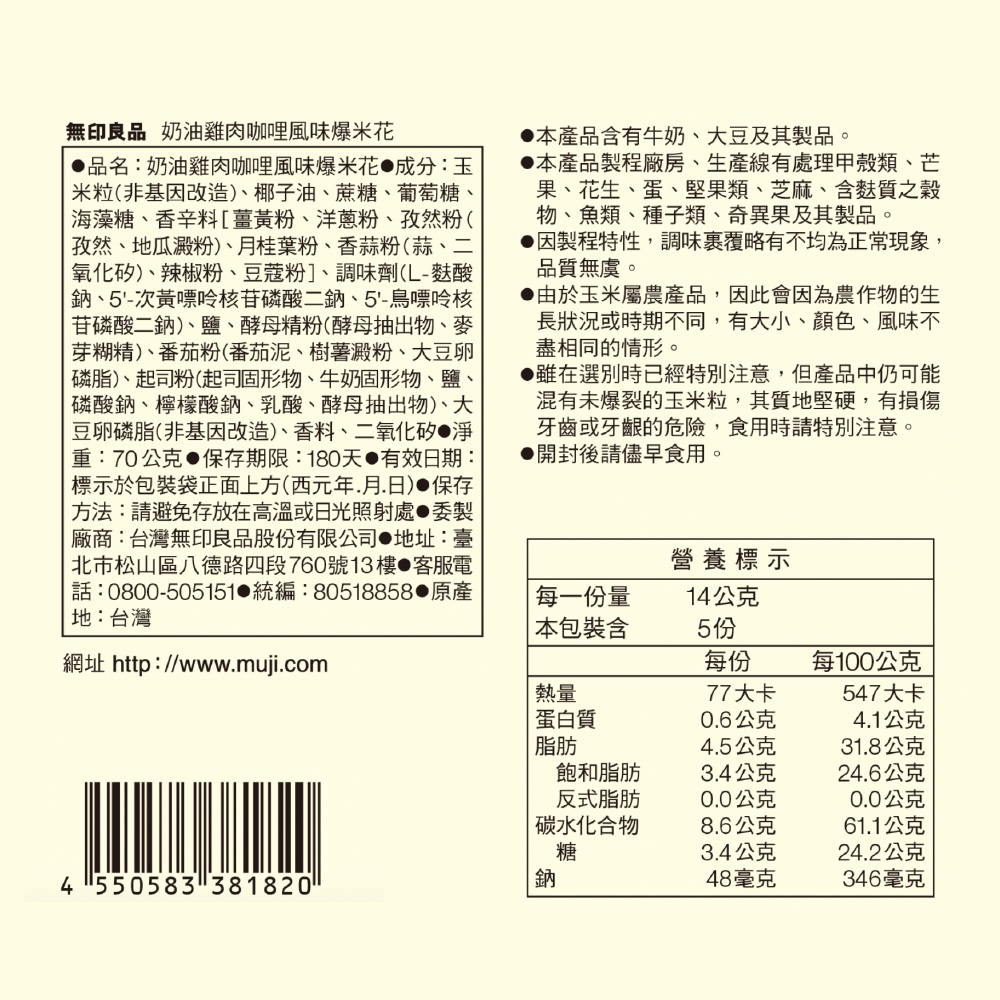 【MUJI 無印良品】奶油雞肉咖哩風味爆米花【MUJI 無印良品】奶油雞肉咖哩風味爆米花PopcornMUJI無印良品 官方旗艦店
