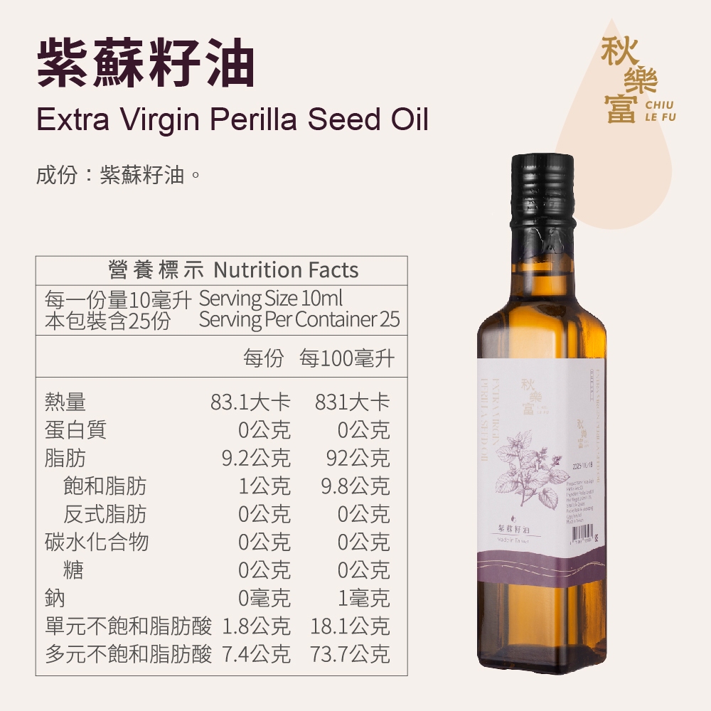 秋樂富 紫蘇籽油 250ml Omega3 冷壓初榨 適合生飲 拌飯拌麵 代替香油 營養補充 平衡Omega-6紫蘇籽油 2027/6/4OilRS睿森嚴選|秋樂富油品