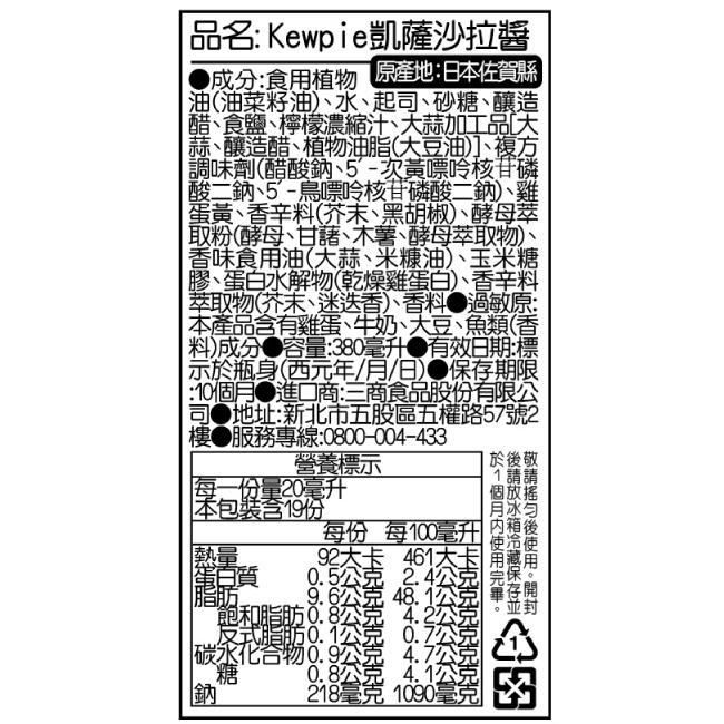 【Kewpie】凱薩沙拉醬 (380ml)【Kewpie】凱薩沙拉醬 (380ml)Seasonings & CondimentsPGI名廚美饌官方網路商店
