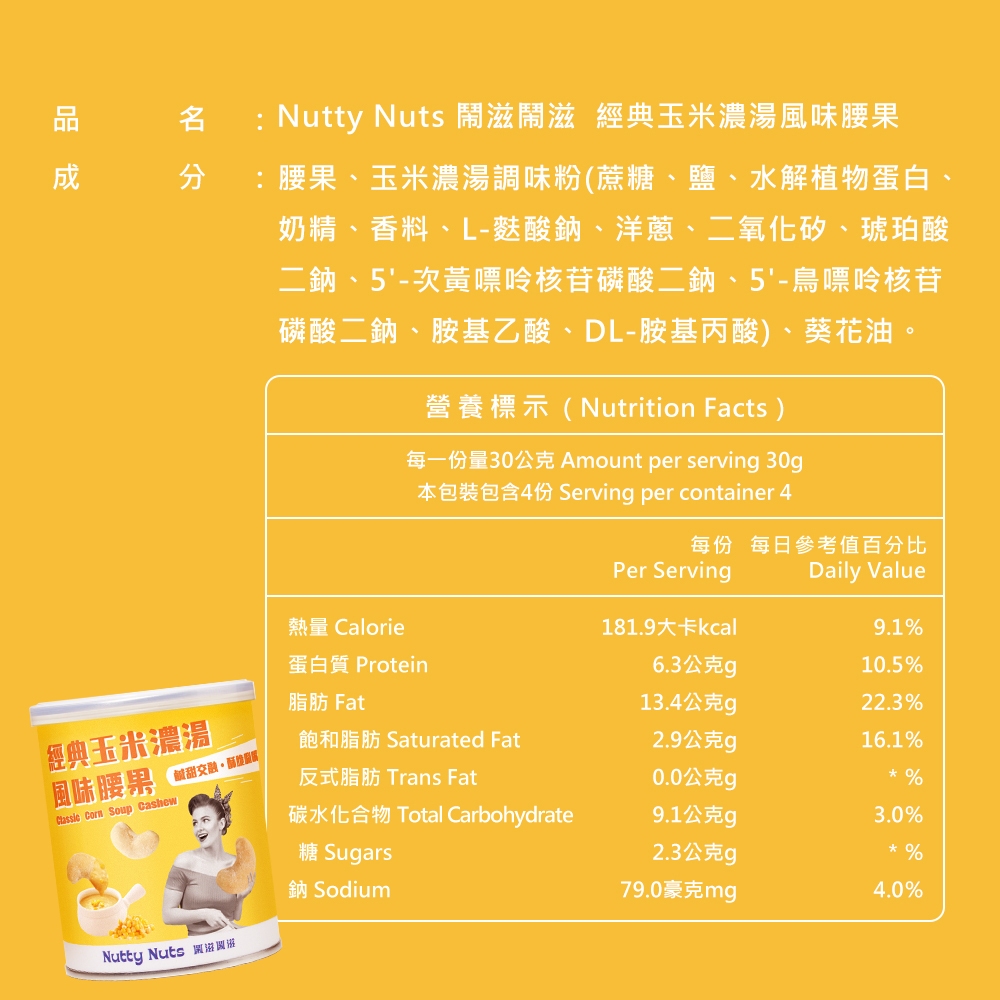 鬧滋鬧滋 【新品上市】經典玉米濃湯風味腰果(120g/罐)療癒系零嘴 派對分享零食鬧滋鬧滋 【新品上市】經典玉米濃湯風味腰果(120g/罐)療癒系零嘴 派對分享零食NutsNutty Nuts 鬧滋鬧滋