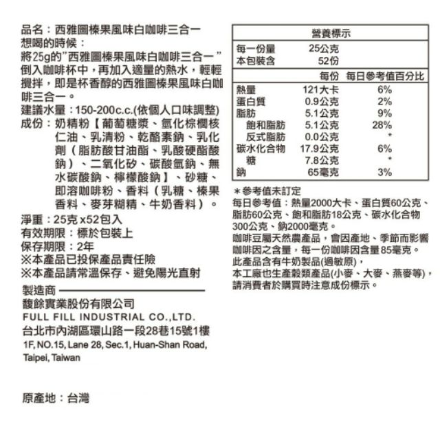 西雅圖榛果風味白咖啡三合一拿鐵(52入/原盒裝)一盒CoffeeNICETER-嚴選