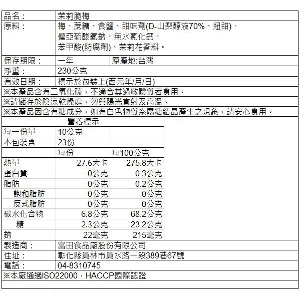 【有顆梅】『茉莉脆梅』經典蜜餞(230公克/包) / 夾鏈袋 / 超商同款 / 超商熱銷款限時特賣選項1|限時特賣選項2|茉莉脆梅(230公克/包)|限時特賣選項3|限時特賣選項4Dried SnacksPLUM’S有顆梅 專業製梅 SINCE1949