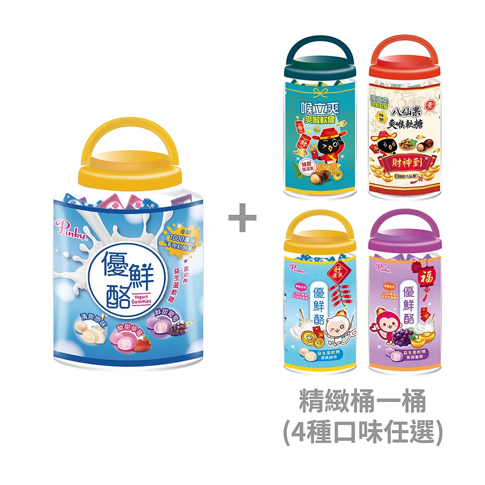 【Pinky】優鮮酪益生菌軟糖_歡樂桶1桶 ( 綜合口味 ) + 精緻桶1桶 ( 4種口味任選 )(桶)優鮮酪綜合口味350g,喉立爽_蜂羅漢果110g|(桶)優鮮酪綜合口味350g,喉立爽_素食蜂膠八仙果110g|(桶)優鮮酪綜合口味350g,Pinky優鮮酪_原味110g|(桶)優鮮酪綜合口味350g,Pinky優鮮酪_葡萄110gSweets & CandyPinky官方旗艦館/五洲生醫