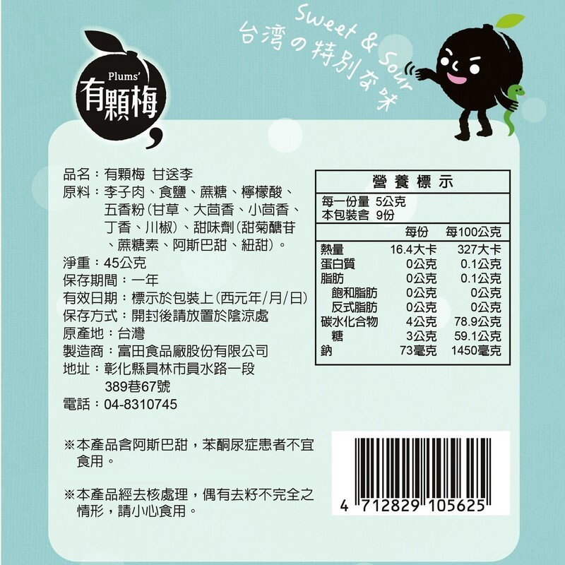 【有顆梅】甘送李(45公克/包)甘草味 Lincorice Dried Prune SINCE1949 現貨 蜜餞 無籽甘送李 45g/包(正常版)Dried SnacksPLUM’S有顆梅 專業製梅 SINCE1949