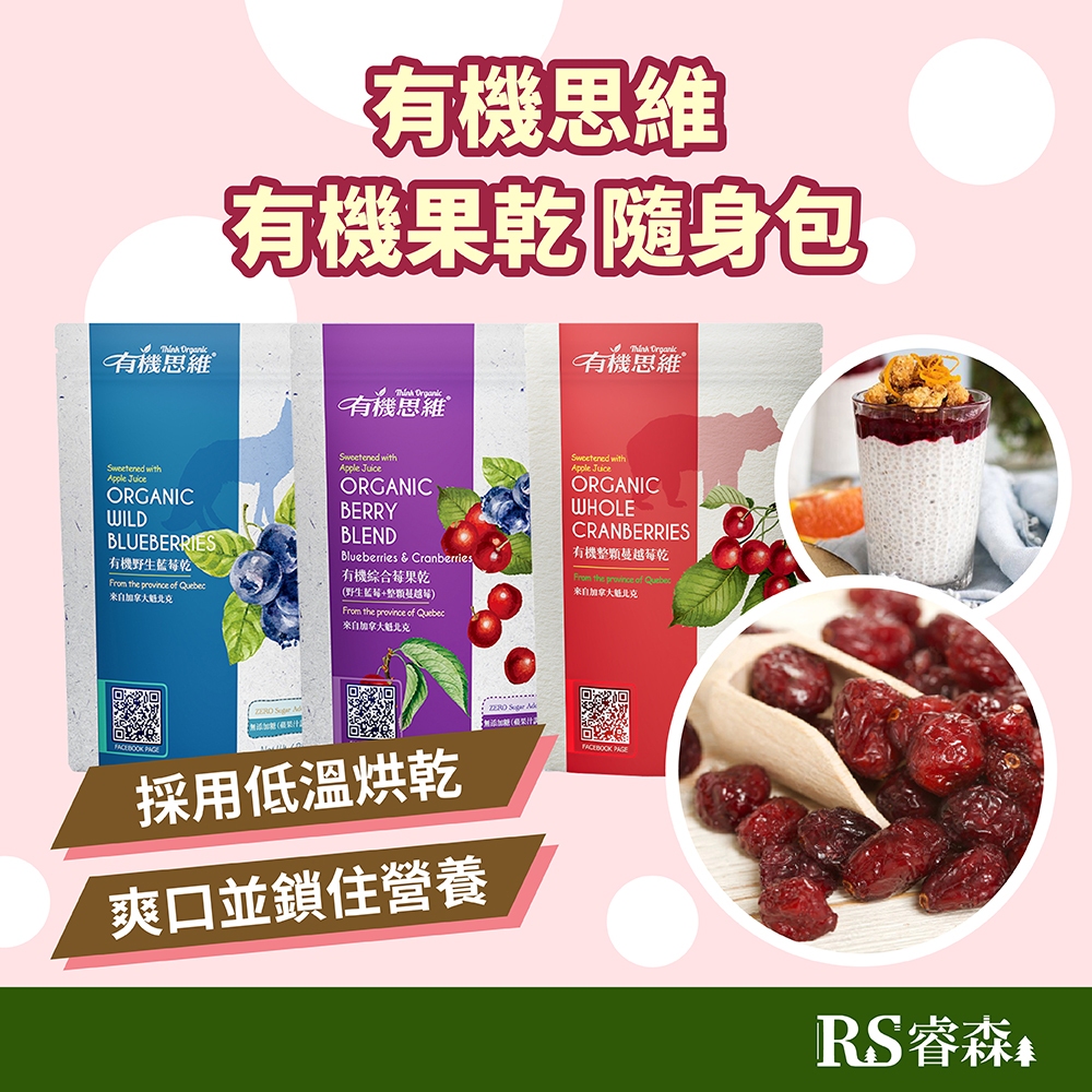 自然思維 有機思維 有機野生藍莓乾 有機整顆蔓越莓乾 有機綜合莓果乾 隨身包28g 有機果乾 加拿大果乾 小包果乾藍莓乾 (小包裝) 2026/2/19|整顆蔓越莓乾 (小包裝) 26/4/29|綜合莓果乾 (小包裝) 26/2/19Dried SnacksRS睿森嚴選|秋樂富油品