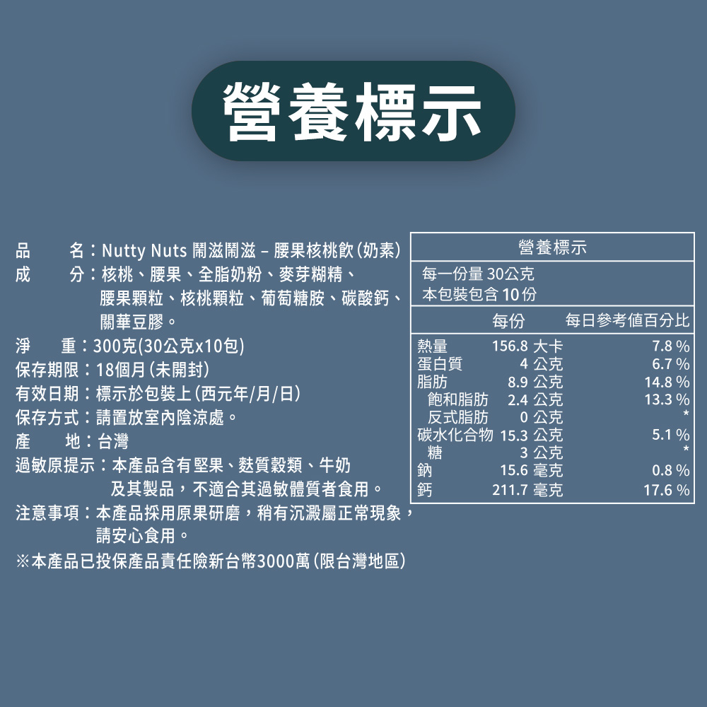 【Nutty Nuts 鬧滋鬧滋】腰果核桃飲(10 天份/盒) | 喝得到腰果、核桃顆粒 | 添加葡萄糖銨、高鈣