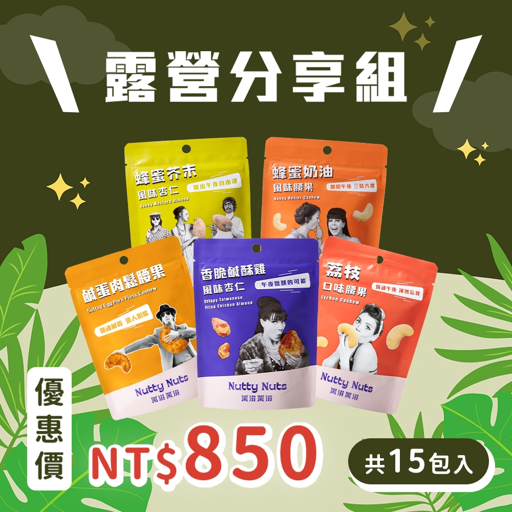 【Nutty Nuts 鬧滋鬧滋】露營限定優惠組 有鹹有甜組(堅果15入)5種超人氣口味超滿足!【Nutty Nuts 鬧滋鬧滋】露營限定優惠組 有鹹有甜組(堅果15入)5種超人氣口味超滿足!NutsNutty Nuts 鬧滋鬧滋