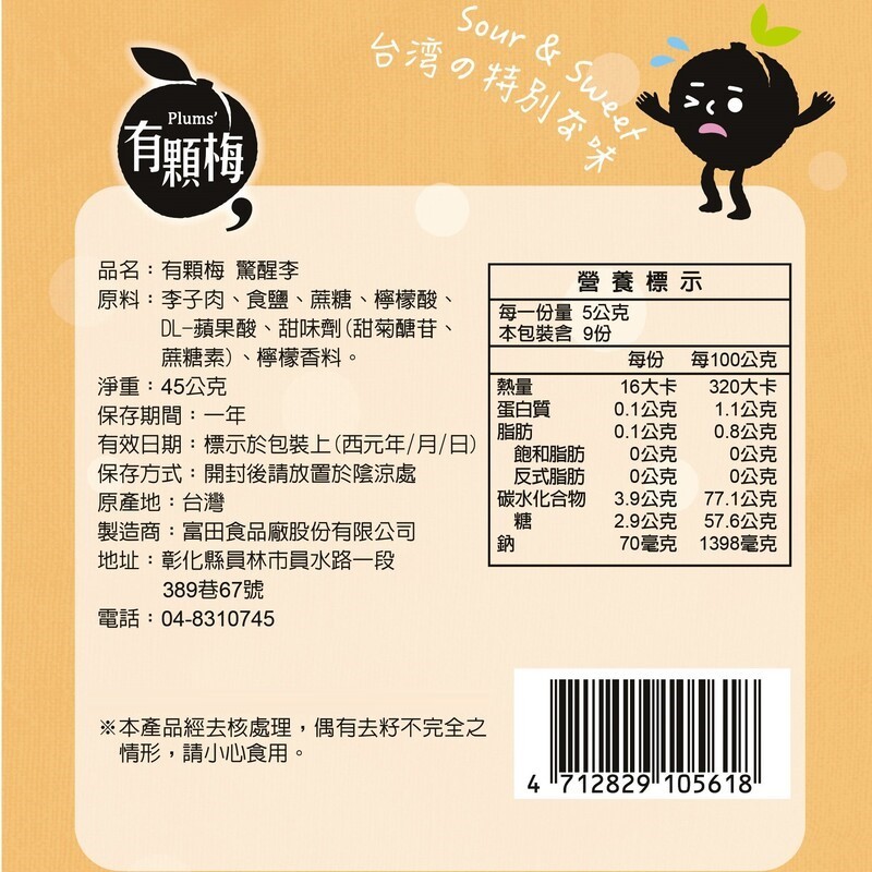 【有顆梅】驚醒李(45公克/包)極酸味 Sour Dried Prune SINCE1949 現貨 蜜餞 無籽 李子正常版<極酸味>驚醒李(45公克/包)Dried SnacksPLUM’S有顆梅 專業製梅 SINCE1949