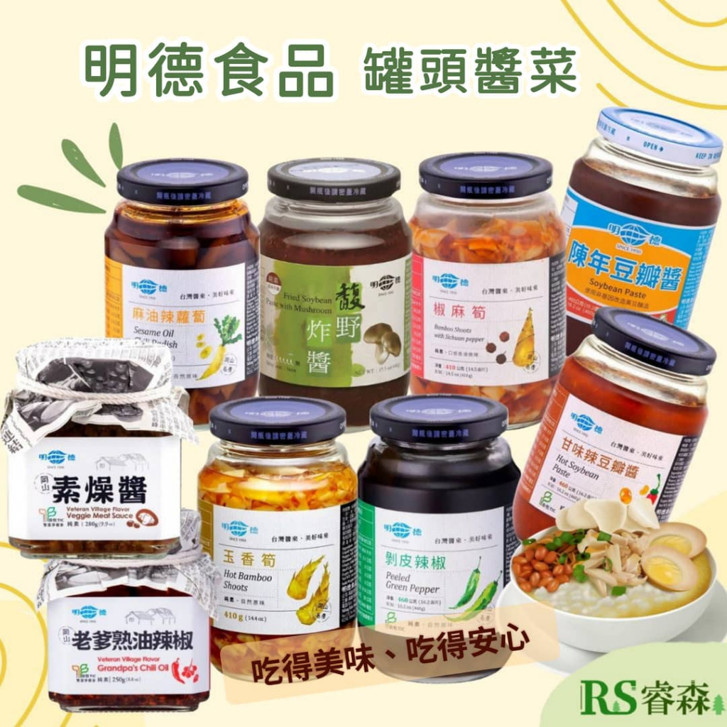 明德食品 罐頭醬菜【9種口味】馥野炸醬 熟油辣椒 素燥醬 剝皮辣椒 辣豆瓣醬 麻油辣蘿蔔 玉香筍 豆瓣醬剝皮辣椒|馥野炸醬|老爹熟油辣椒 2028/1/12|素燥醬 2026/4/26|陳年豆瓣醬 2026/11/12|甘味辣豆瓣醬|麻油辣蘿蔔 2027/3/24|玉香筍|椒麻筍Seasonings & CondimentsRS睿森嚴選|秋樂富油品