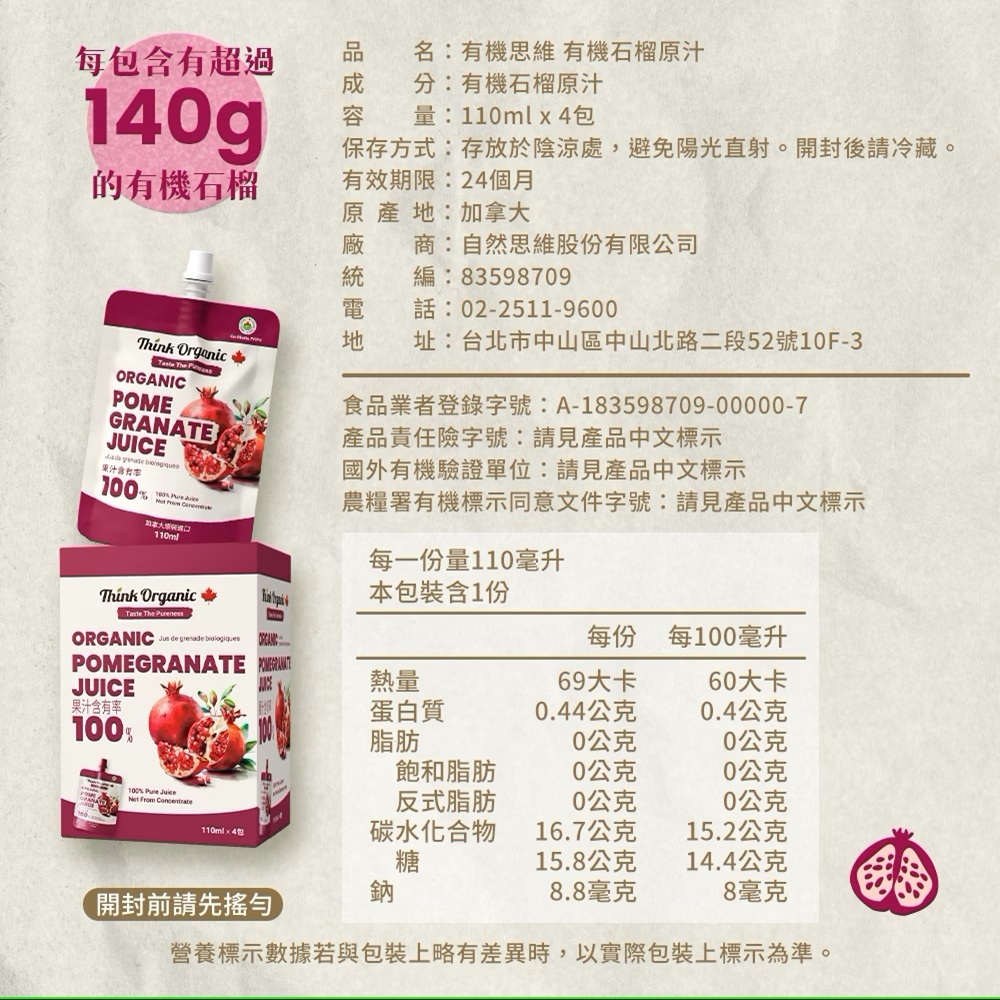 有機思維 自然思維 100%果汁 隨手包110ml 石榴原汁 藍莓原汁 蔓越莓原汁 黑棗原汁 法國勃根地氣泡天然礦泉水(短效期)法國氣泡水 25.08.13|有機藍莓原汁 隨手包26/12/16|有機石榴原汁 隨手包 26/12/18|有機蔓越莓原汁 隨手包26/12/17|天然黑棗原汁 隨手包26/12/16Juice & Juice VinegarRS睿森嚴選|秋樂富油品