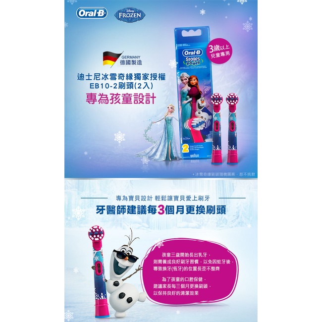 德國百靈Oral-B 電動牙刷兒童冰雪奇緣刷頭(2入)EB10-2 歐樂B 電動牙刷配件耗材 三個月更換刷頭2入組Oral CareOral-B歐樂B|恆隆行官方旗艦館