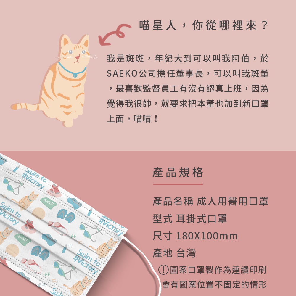 【SAEKO】成人用醫療口罩 愛游泳的貓 台灣製 雙鋼印 日安美 一袋5入【SAEKO】成人用醫療口罩 愛游泳的貓 台灣製 雙鋼印 日安美 一袋5入Medical Gloves & MasksSAEKO泳鏡商城