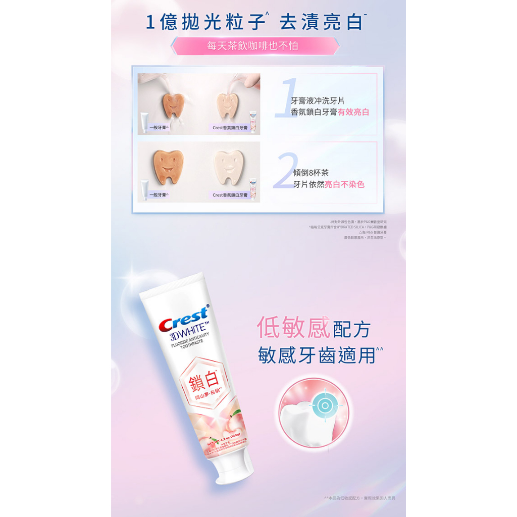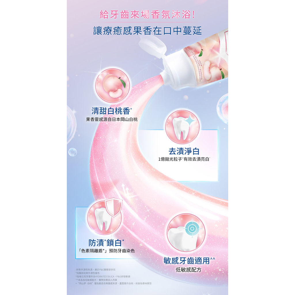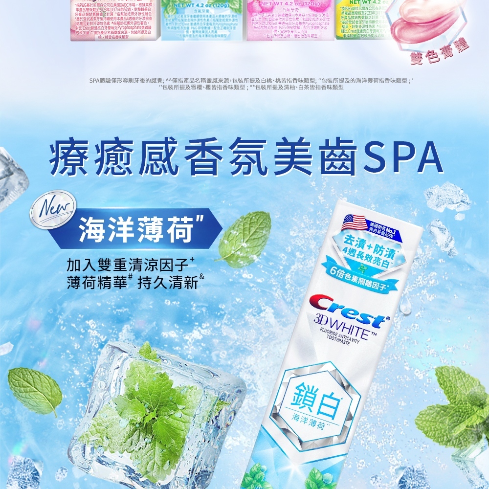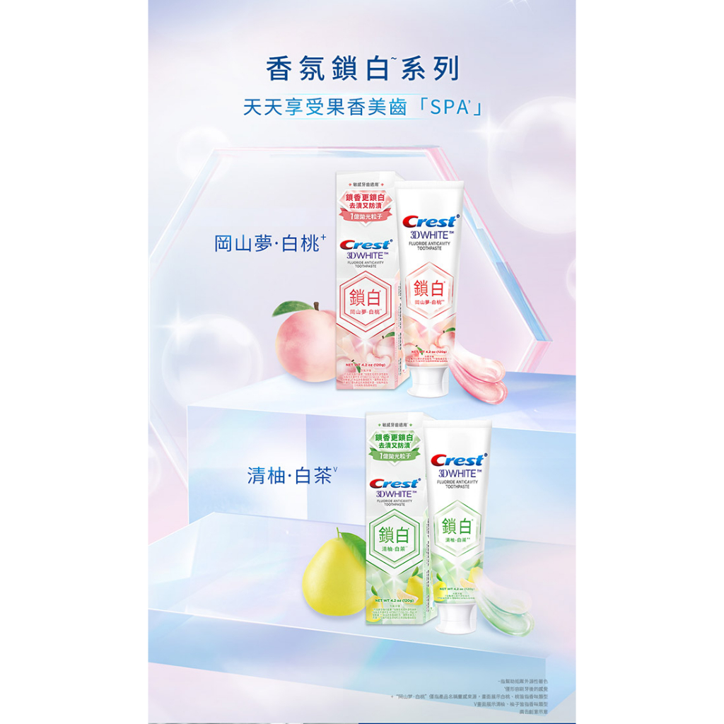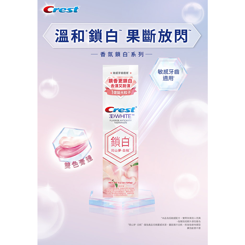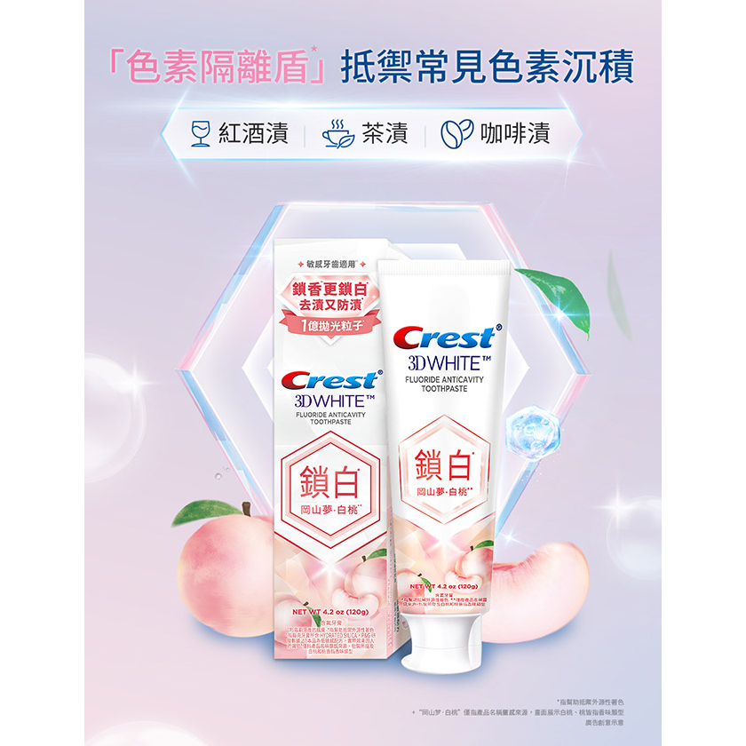 【Crest】香氛鎖白牙膏 120g 3入、6入、12入 (岡山夢•白桃、清柚•白茶、海洋薄荷、清新雪櫻)岡山夢•白桃x12入|清柚•白茶x12入|岡山夢•白桃x6入|清柚•白茶x6入|海洋薄荷x3入|清新雪櫻x3入|海洋薄荷x6入|清新雪櫻x6入|岡山夢•白桃x3入|清柚•白茶x3入Oral CareP&G寶僑旗艦店-幫寶適/一級幫/超薄乾爽/液體衛生棉/Ariel/官方旗艦店