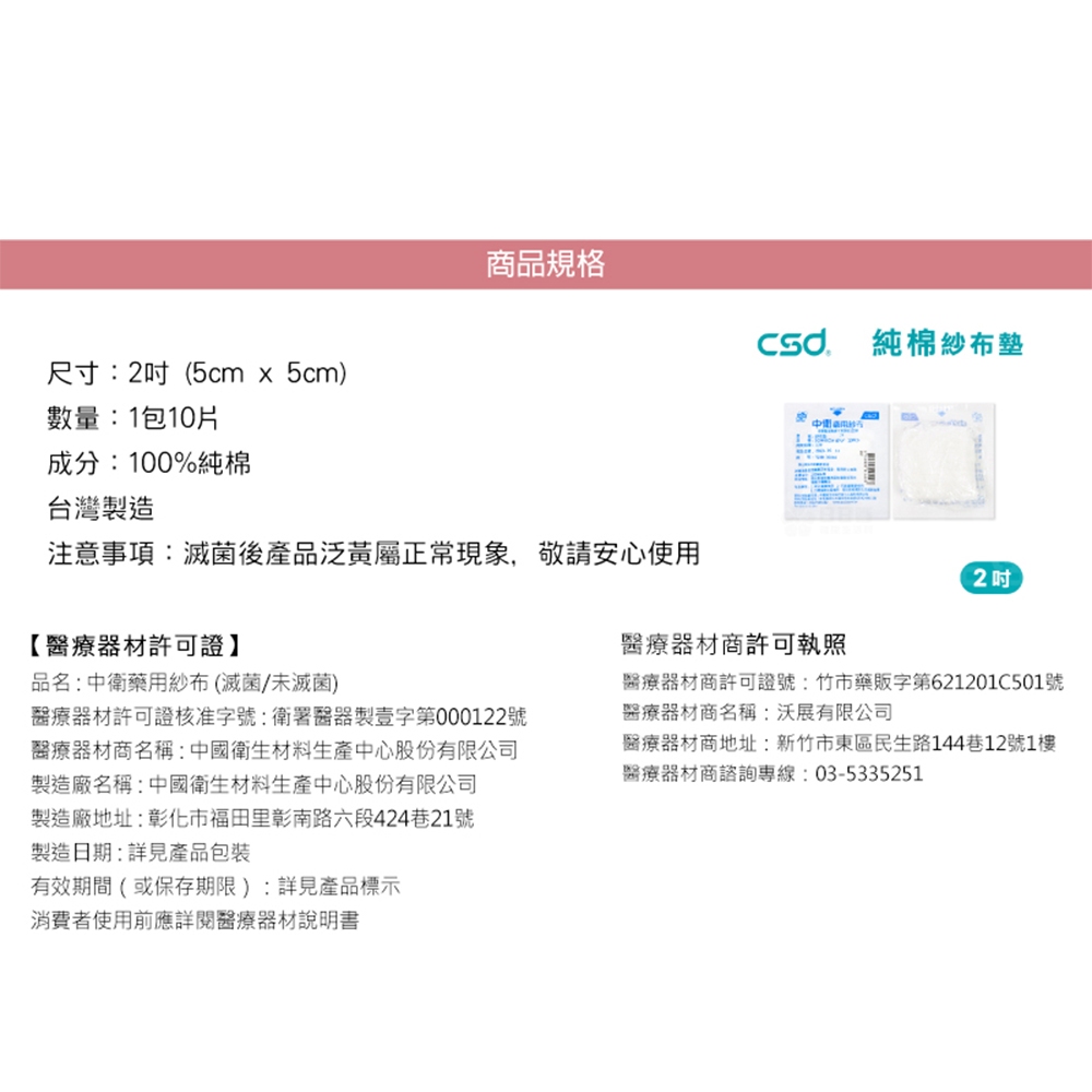 【台灣製】中衛CSD 純棉 紗布墊 藥用紗布 紗布墊 2吋 1包(10片/包)