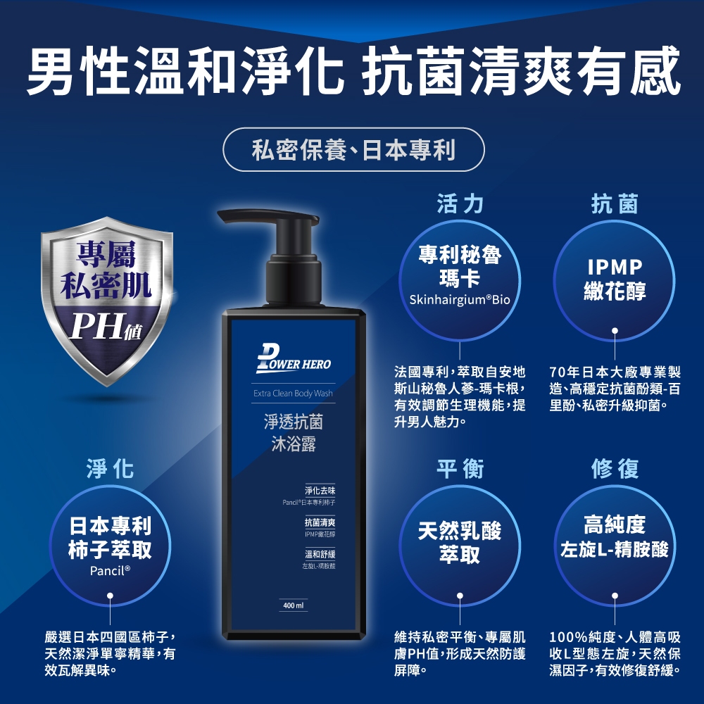 【PowerHero】男仕抗菌私密沐浴露/沐浴乳 1入組(400ml/入) 加價購$390《潔淨升級、抗菌植萃》