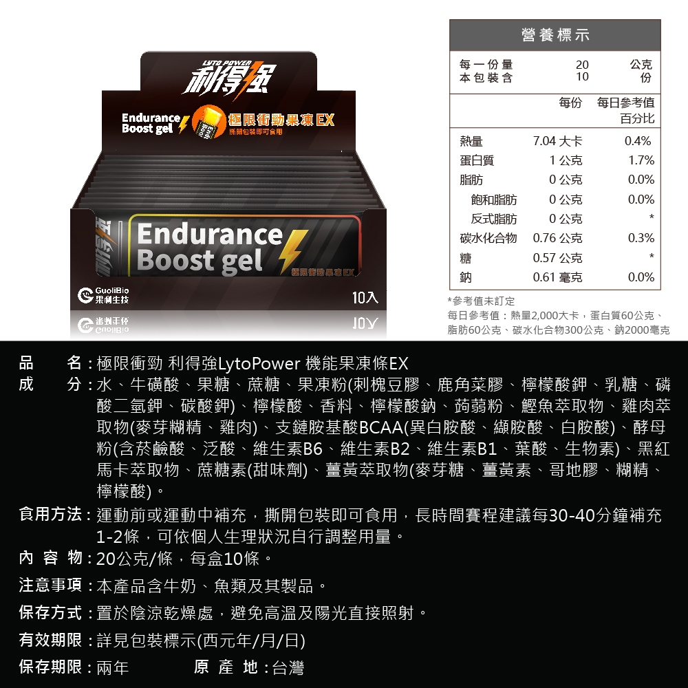 果利生技 利得強® Lytopower 能量補給果凍條Ex (運動狂人) BCAA 牛磺酸 雙胜肽 [馬拉松必備]能量果凍條一盒20入,時效2026/3|能量果凍條一盒10入,時效2026/3FitnessSPORTYMAD運動狂人 官方旗艦店