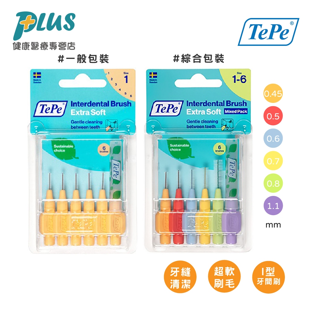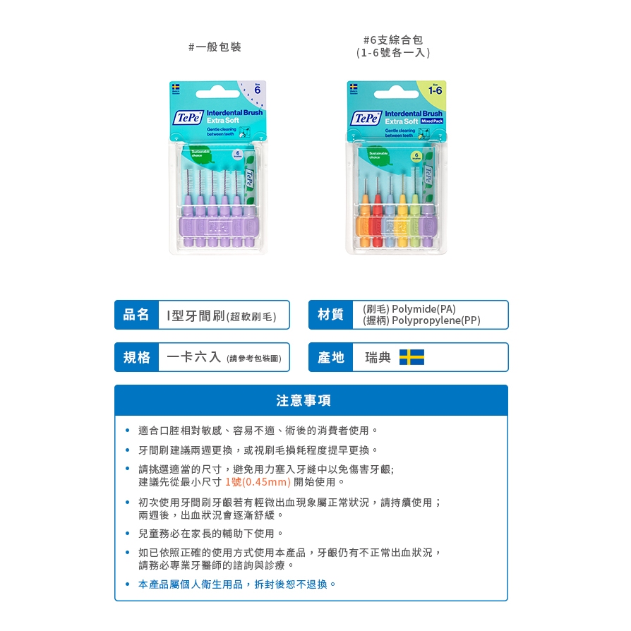 【TePe 緹碧】I型牙間刷 (超軟刷毛)1號0.45mm 淺橘(6支入)|2號0.5mm 淺紅(6支入)|3號 0.6mm 淺藍(6支人)|4號 0.7mm 淺黃(6支入)|5號 0.8mm 淺綠(6支入)|6號 1.1mm 淺紫(6支入)|綜合包1-6號各一入Oral Careplus健康醫療專營店