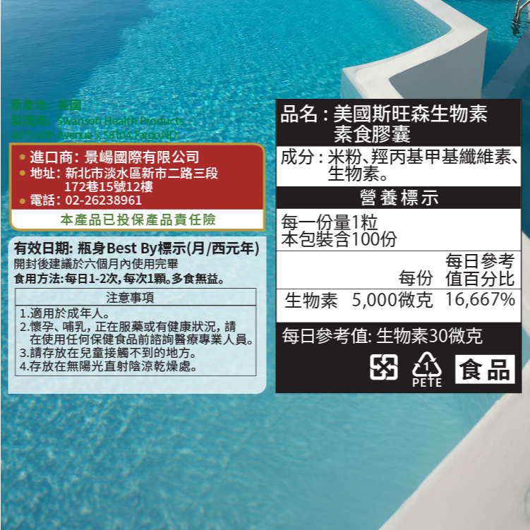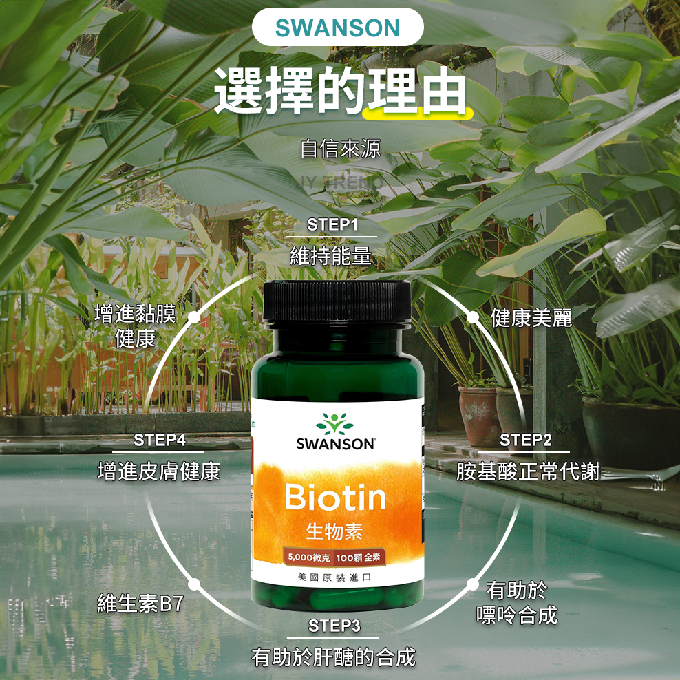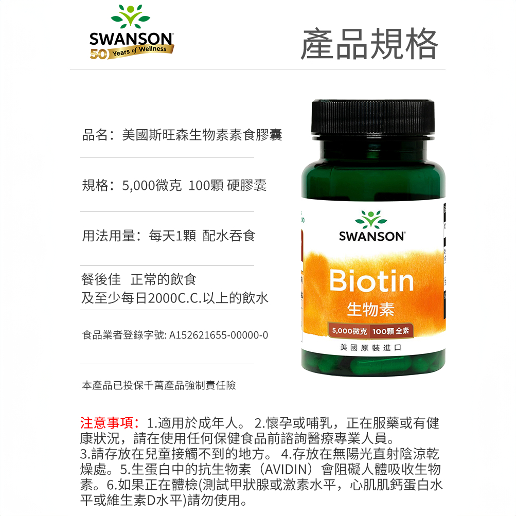 【SWANSON 美國斯旺森】生物素 Biotin 5000mcg 100顆 維他命H B7全新現貨 5000微克 100顆 硬膠囊|5000微克 100顆 硬膠囊Well BeingSWANSON 美國斯旺森 原廠授權台灣獨家經銷