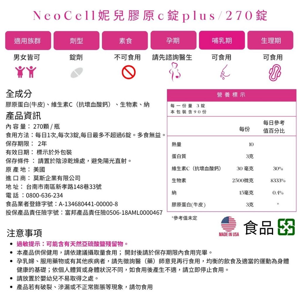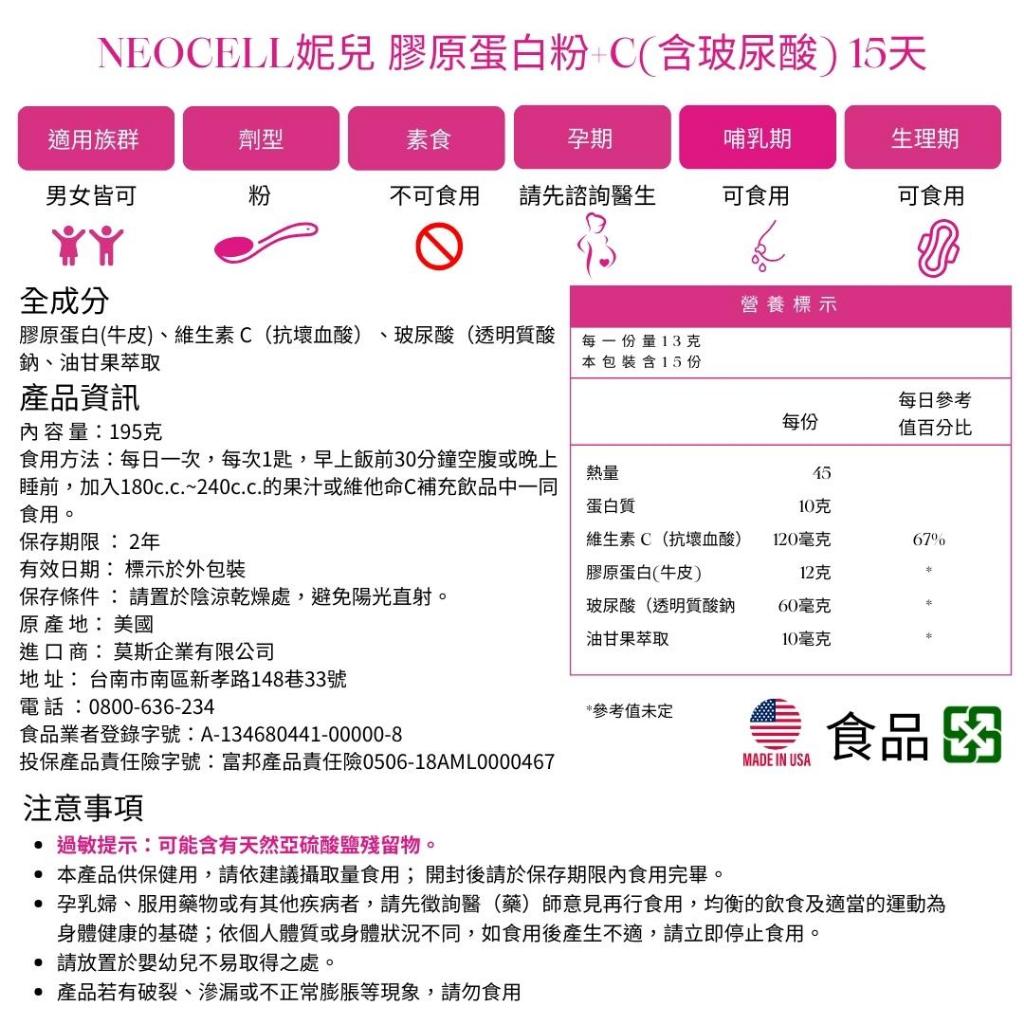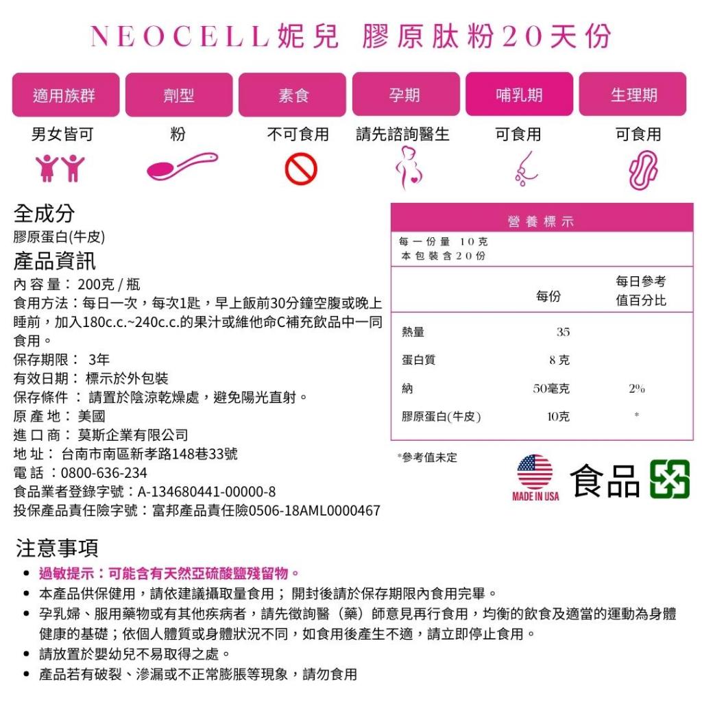 【妮萃美】NeoCell妮兒-膠原蛋白(270錠/粉20天/粉15天/綜合營養體驗包)※台灣總代理※官方唯一授權粉+C(含玻尿酸) 15天/202507|膠原肽粉-20天份|膠原蛋白錠+C PLUS-270錠|綜合營養體驗包|膠原蛋白錠+C-250錠|膠原蛋白錠+C PLUS-90錠|膠原蛋白錠+C-120錠Beauty SupplementsNutriBeauty 妮萃美保健生活館
