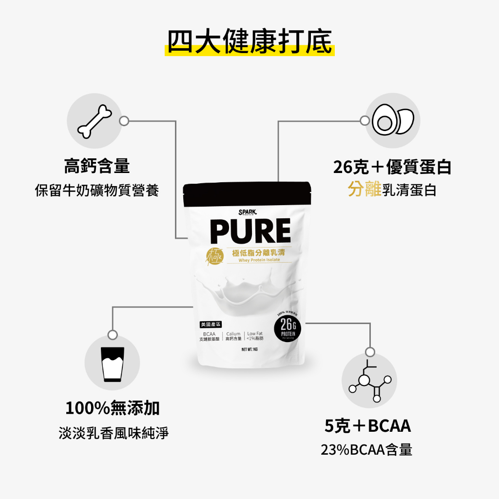 Spark Pure極 – 低脂分離乳清蛋白 植物分離乳清1公斤袋/ Pure+極致高效分離乳清|分離乳清 植物分離乳清極致高效分離乳清500g(荷蘭)-附湯匙|極致高效分離乳清1kg組(荷蘭)-附湯匙|極-低脂分離乳清蛋白1kg(美國)|極 – 高纖豌豆分離蛋白1kg|極 – 低脂分離乳清900g (德國)|極 – 低脂分離大豆蛋白1kg(美國)|極 – 高鈣分離大豆蛋白1kg(美國)FitnessSpark Protein
