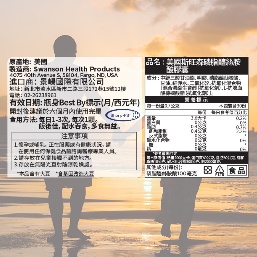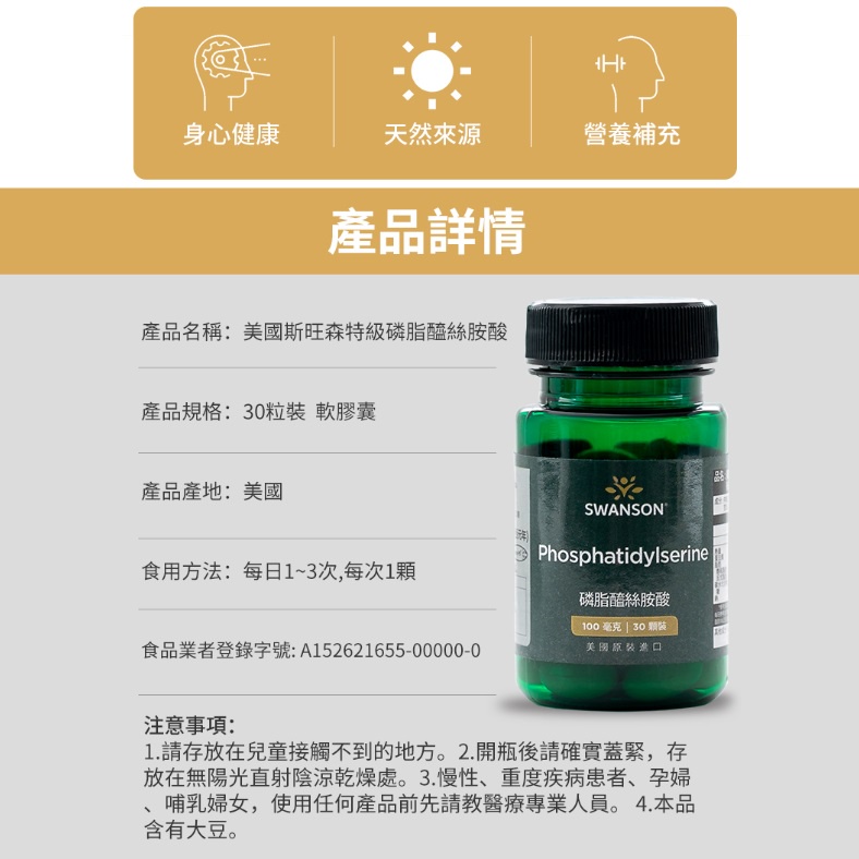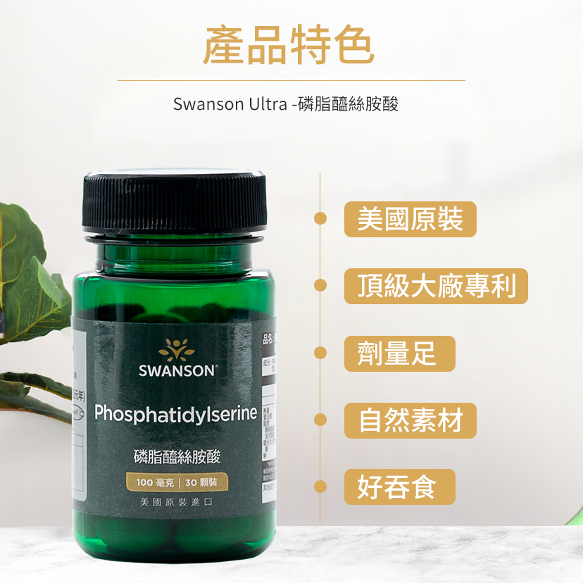【SWANSON 美國斯旺森】 磷脂醯絲胺酸 腦磷脂 100毫克 30顆裝 Phosphatidylserine 進口現貨|全新現貨Well BeingSWANSON 美國斯旺森 原廠授權台灣獨家經銷