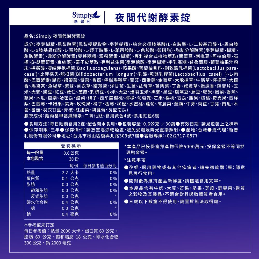 【Simply新普利】夜間代謝酵素錠 (30錠/盒)x6盒 (促進代謝 必需胺基酸 夜食酵素)6盒Well BeingSimply新普利酵素官方旗艦店