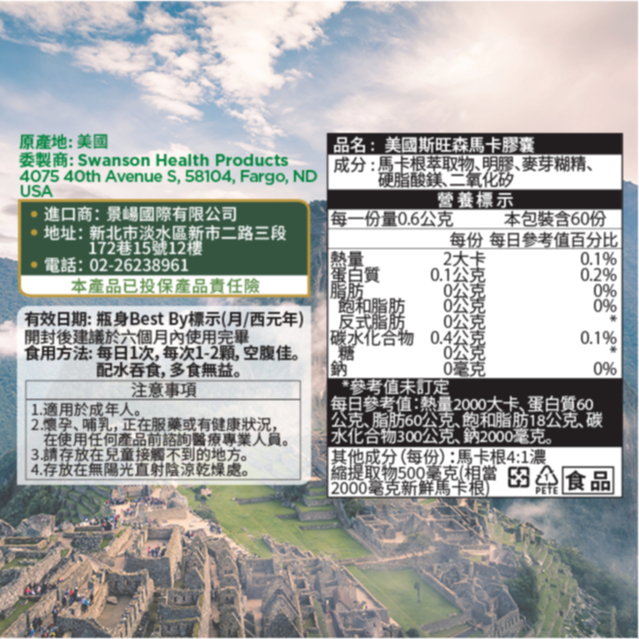 【SWANSON 美國斯旺森】 馬卡 500mg 60顆 瑪卡 草本 2000mg Maca 四倍濃縮 原裝 進口全新現貨|現貨Well BeingSWANSON 美國斯旺森 原廠授權台灣獨家經銷