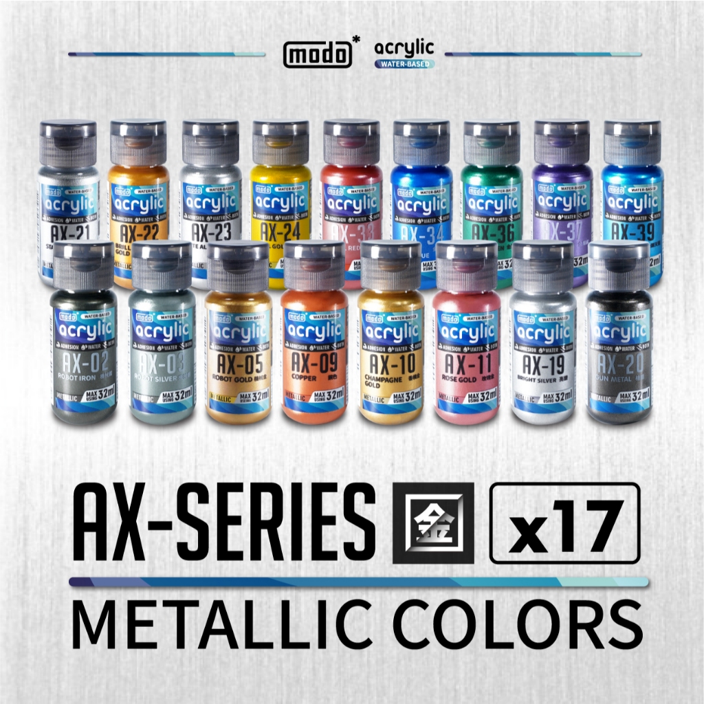 【modo摩多製造所】萬用水漆 AX金屬色 綜合賣場/32ML/模型漆/水漆|官方賣場金屬,AX05 機械金|金屬,AX20 槍鐵|金屬,AX21 星光銀|金屬,AX02 機械鐵|金屬,AX03 機械銀|金屬,AX09 銅色|金屬,AX10 香檳金|金屬,AX11 玫瑰金|金屬,AX19 亮銀|金屬,AX22 絢金|金屬,AX23 啞鋁|金屬,AX24 皇家金|金屬,AX33 金屬紅|金屬,AX34 金屬寶藍|金屬,AX36 金屬綠|金屬,AX37 金屬紫|金屬,AX39 金屬天藍Mecha Models & Diecastmodo摩多製造所
