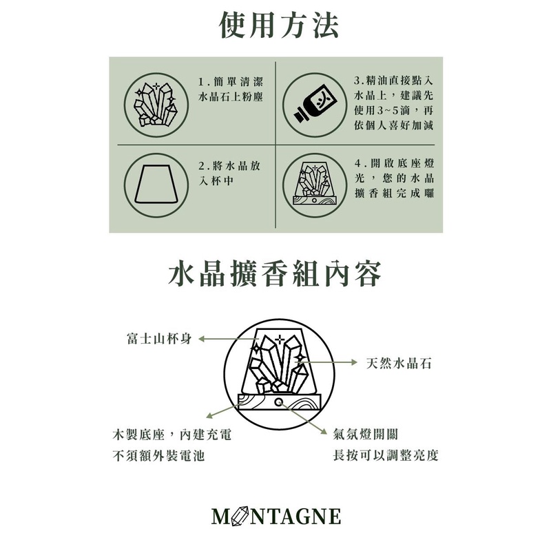【Montagne】綠螢石。黃水晶。白水晶|新年限定|富士山水晶擴香組 精油可選不贈精油|薰衣草10ml|甜橙10ml|佛手柑10ml|葡萄柚10ml|快樂鼠尾草10ml|檀香10ml|寵物友善 清風100ml|寵物友善 朝露100ml|寵物友善 冬陽100mlStones & MineralsMontagne 山造