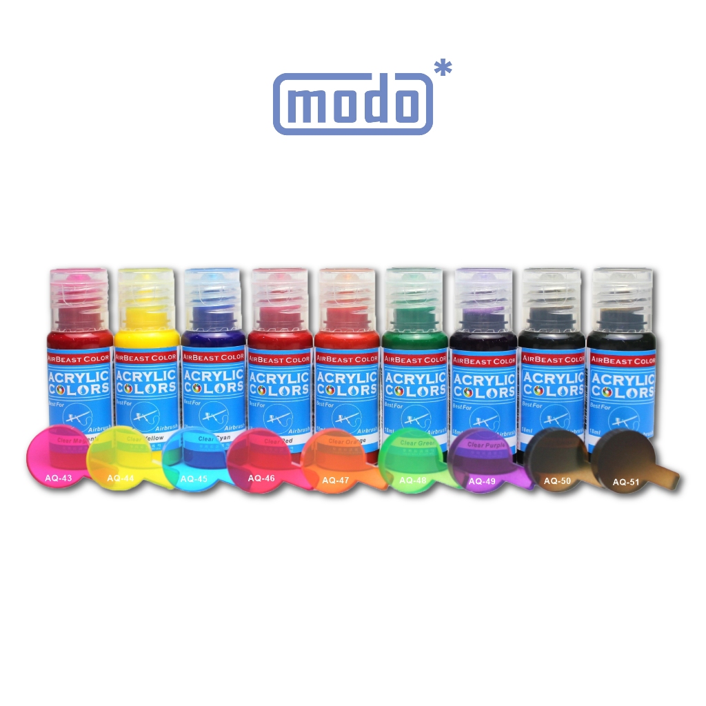 【AirBeast】水性壓克力顏料透明色系/20ml/modo摩多製造所|官方賣場AQ-51 消光煙燻色|AQ-43 透明洋紅|AQ-45 透明青|AQ-48 透明綠|AQ-49 透明紫|AQ-50 亮光煙燻色|AQ-44 透明黃|AQ-46 透明紅|AQ-47 透明橙Mecha Models & Diecastmodo摩多製造所