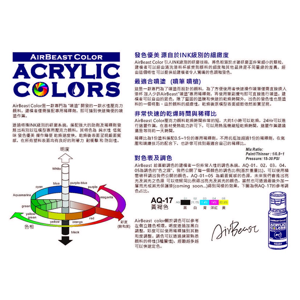 【AirBeast】水性壓克力顏料(單罐)/modo摩多製造所|官方賣場AQ-17黃褐色|AQ-01黑色|AQ-02白色|AQ-05黃色|AQ-12天藍色|AQ-03青色|AQ-09檸檬黃|AQ-13藍色|AQ-18灰色|AQ-04洋紅|AQ-06紅色|AQ-10黃綠色|AQ-16棕色|AQ-15紫色|AQ-07澄色|AQ-08黃澄色|AQ-11綠色|AQ-14靛色|AQ-20輕度消光透明色|AQ-21重度消光透明色|AQ-19亮光透明色|AQ-27北約黑|AQ-23暗黃色|AQ-26北約棕|AQ-29機體內部色2 美國陸軍、海軍機|AQ-30深綠色|AQ-24RLM02灰|AQ-25北約綠|AQ-22德國灰|AQ-28機體內部色1 美國陸軍、海軍機Mecha Models & Diecastmodo摩多製造所