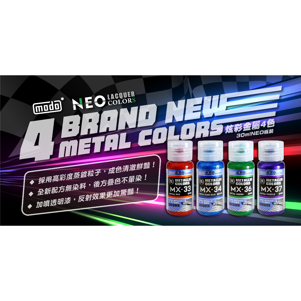【modo摩多製造所】NEO炫彩金屬四色綜合賣場/金屬紅/金屬深藍/金屬綠/金屬紫/30ML/模型漆|官方賣場MX36金屬綠|MX37金屬紫|MX33金屬紅|MX34金屬深藍Mecha Models & Diecastmodo摩多製造所
