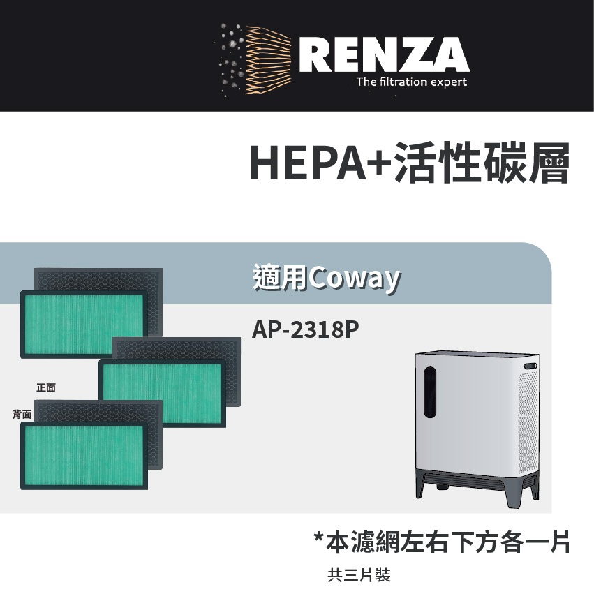 適用Coway AP-2318P 2318 綠淨力 三重防禦 空氣清淨機 抗菌HEPA活性碳濾網 濾芯 三片入適用Coway AP-2318P 2318 綠淨力 三重防禦 空氣清淨機 抗菌HEPA活性碳濾網 濾芯 三片入Air TreatmentRenza Filtration 濾網專家