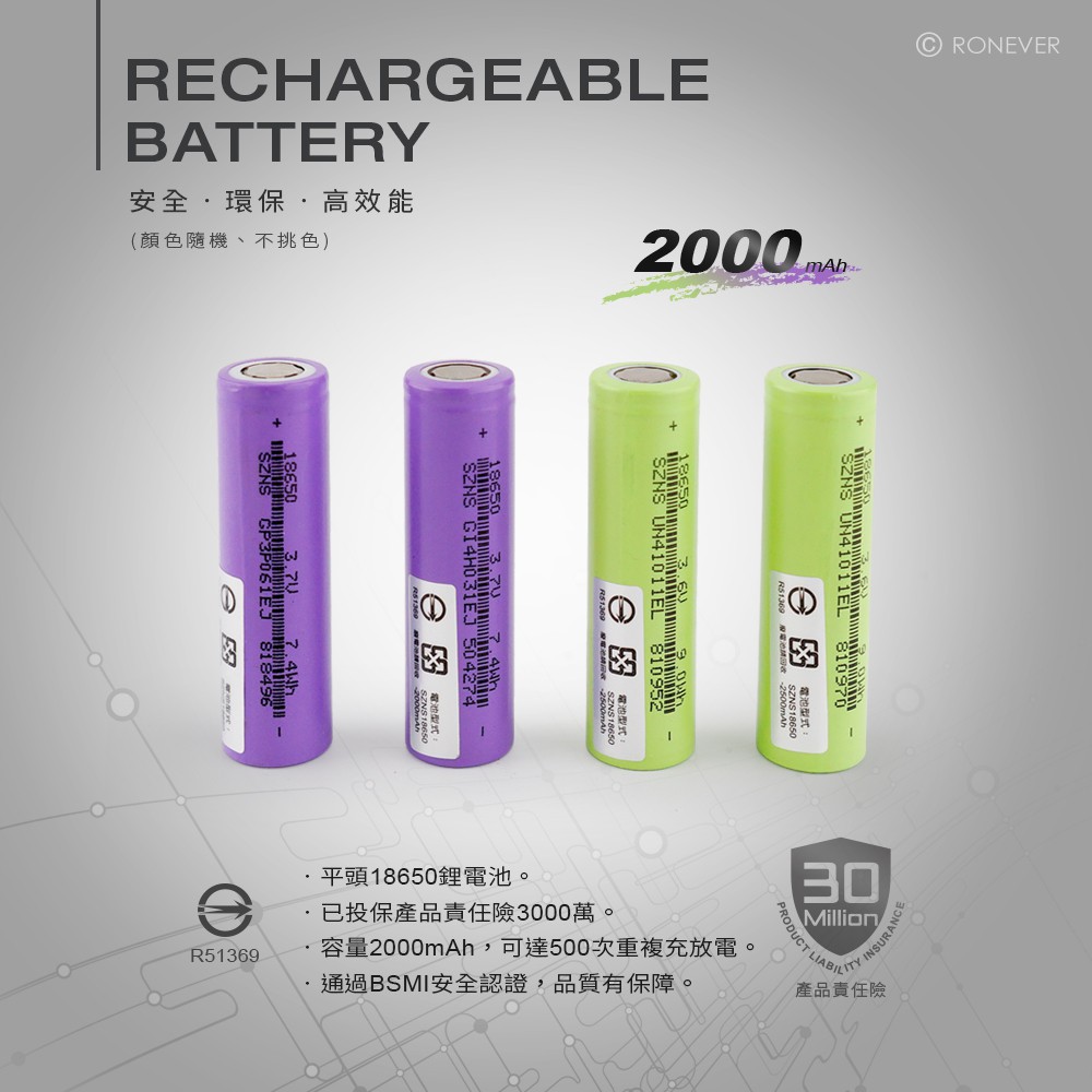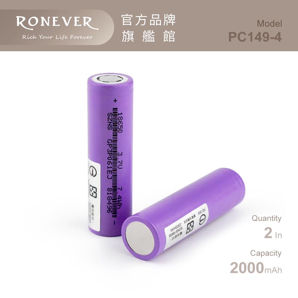 RONEVER PC149-4 / 18650鋰電池-2000mAh(兩入)PC149-4RONEVER 官方品牌館