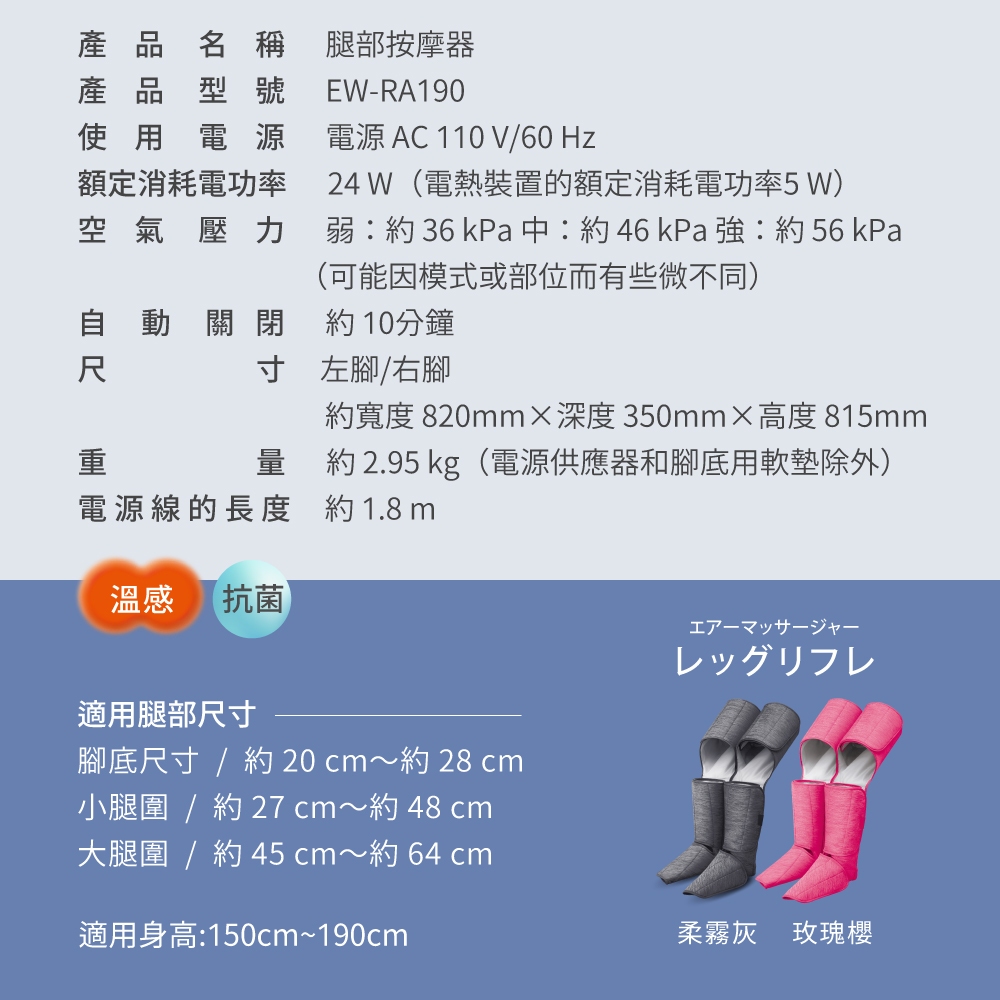 Panasonic 溫感氣動足腿按摩靴 EW-RA190 (運動後、久站久走超舒緩)灰色|桃粉色OthersPanasonic 健康按摩館