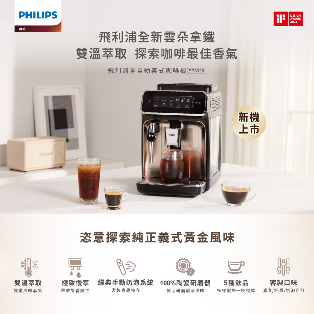 【Philips 飛利浦】雙溫萃取全自動義式咖啡機 經典銀(EP3326/94)單機Coffee Machines & AccessoriesPhilips 飛利浦家電旗艦館