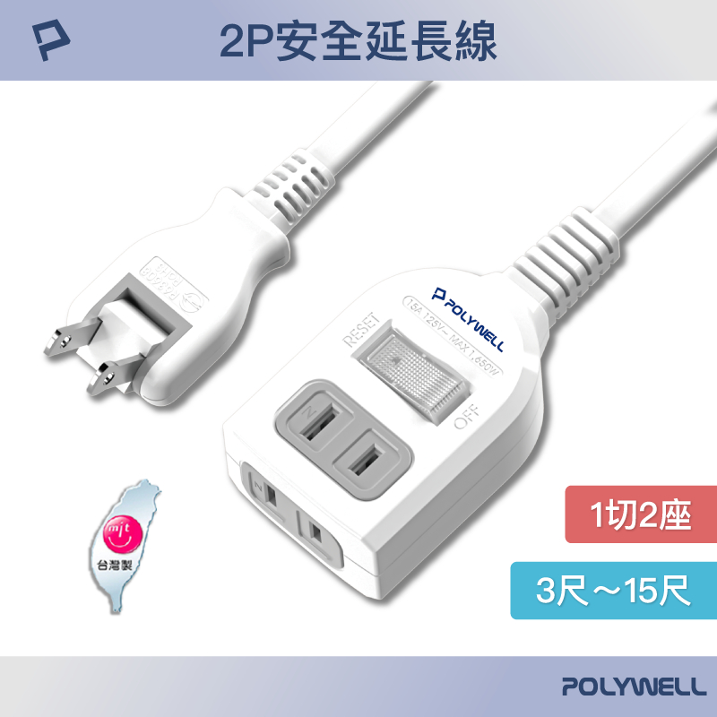 POLYWELL 2P一切2座電源延長線 帶開關2插座 台灣製造MIT 過載保護 防火材質 自動斷電 寶利威爾 台灣現貨3尺 (90公分)|6尺 (180公分)|9尺 (270公分)|12尺 (360公分)|15尺 (450公分)Electric Sockets & Extension CordsPOLYWELL寶利威爾官方旗艦店