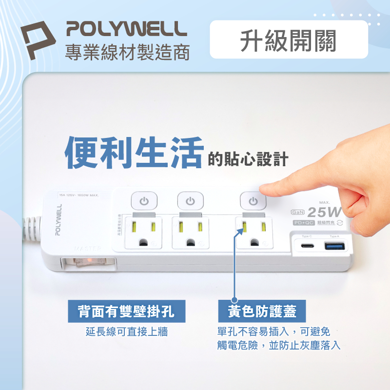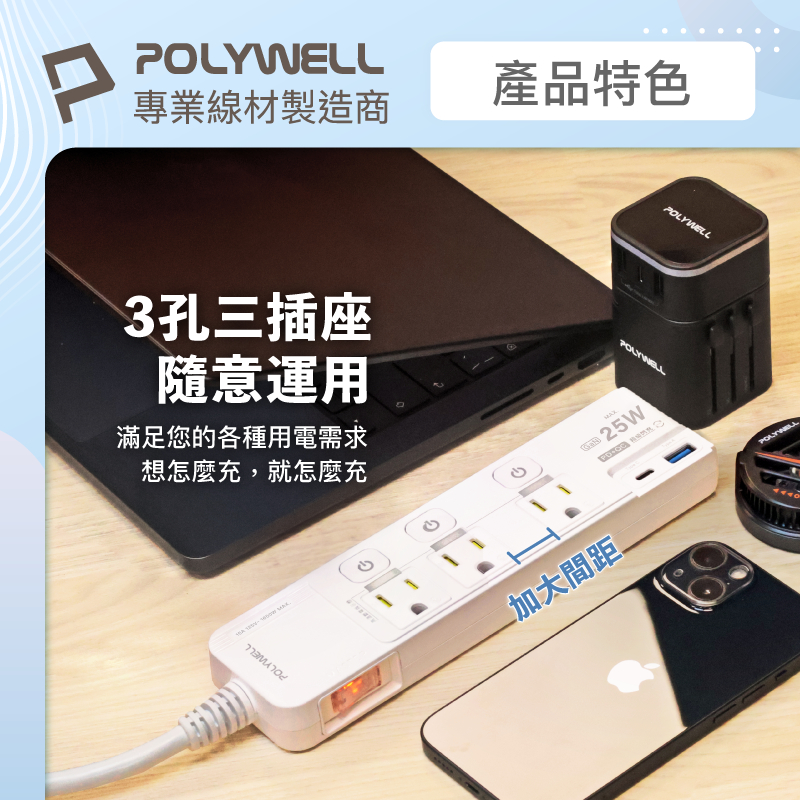 POLYWELL 25W快充電源延長線 4切3座 Type-C PD/QC雙協議 過載保護 自動斷電 寶利威爾 台灣現貨25W(黑色)|25W(白色)|20W(黑色)|20W(白色)Electric Sockets & Extension CordsPOLYWELL寶利威爾官方旗艦店