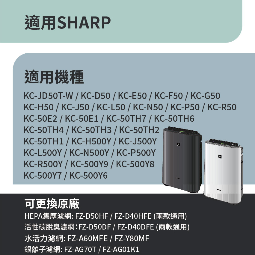 適用Sharp夏普 KC-JD50T-W KC-D50 KC-E50 KC-F50 KC-G50 KC-H50 濾網濾芯1片抗敏HEPA濾網|1片蜂巢活性碳濾網(除臭除甲醛)|1片水活力濾網|1支銀離子Air TreatmentRenza Filtration 濾網專家