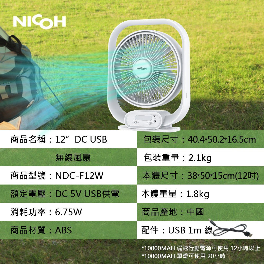 日本NICOH12吋 DC USB無線風扇NDC-F12W一入CoolingRUYUHOUSE