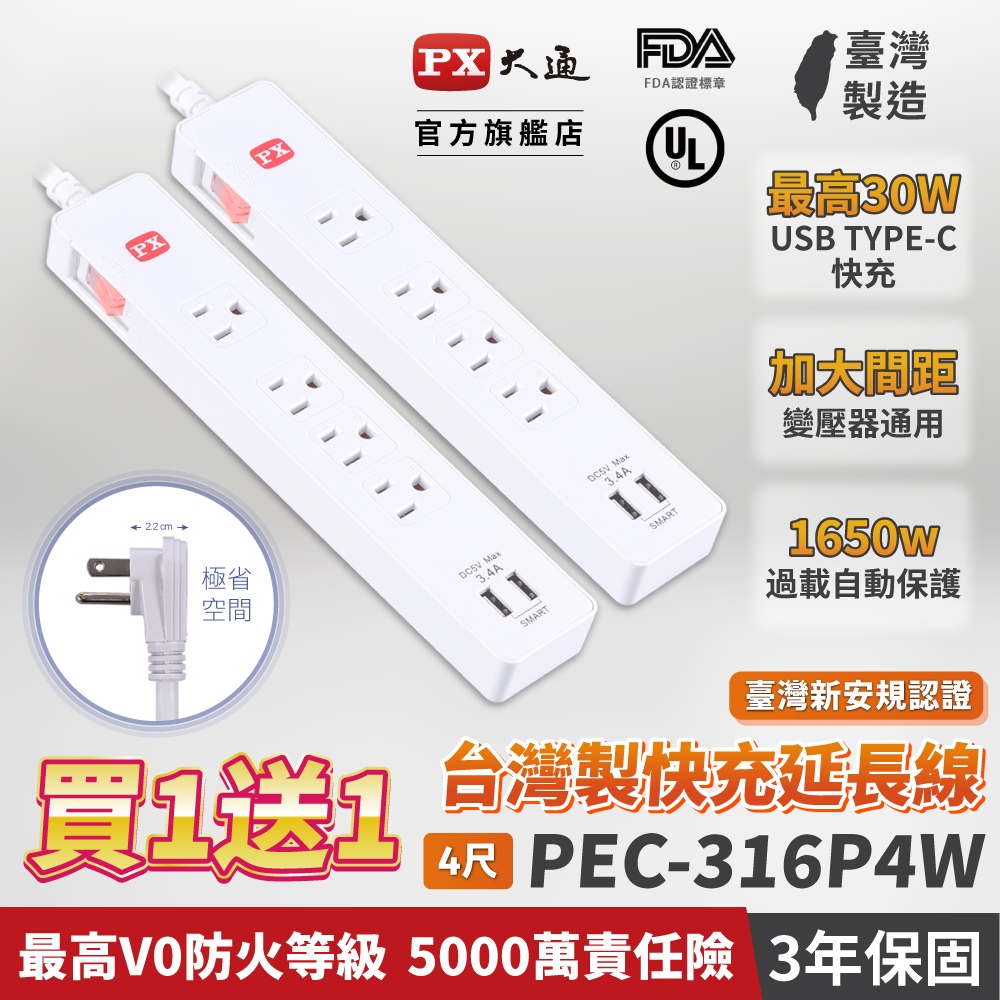 PX大通 買1送1 TYPE C USB 延長線 PEC-316P4W 1切6座4尺 20W 快充 台灣製造 3年保固買1送1✨PEC-316P4W|PEC-316P4W(單條)Electric Sockets & Extension CordsPX大通電子官方UHD 8K HDMI影音旗艦館