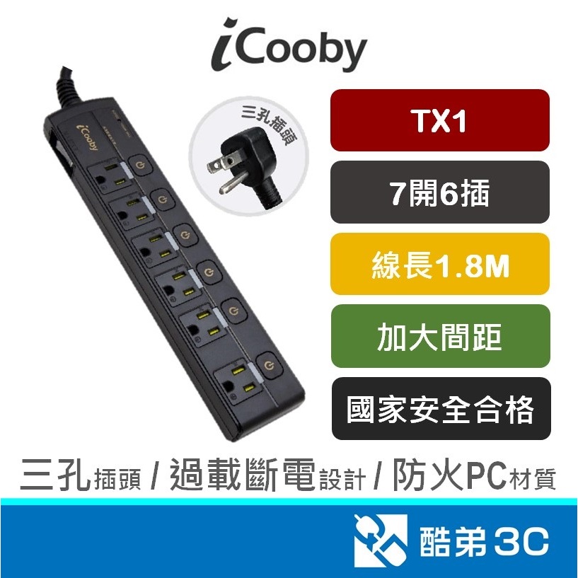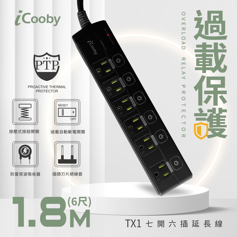 iCooby TX1 七開六插 延長線 1.8M 3孔延長線 防火PC材質 過載自動斷電開關 6尺 安規認證 三插iCooby TX1 七開六插 延長線 1.8M 3孔延長線 防火PC材質 過載自動斷電開關 6尺 安規認證 三插Electric Sockets & Extension CordsQD 酷弟3C