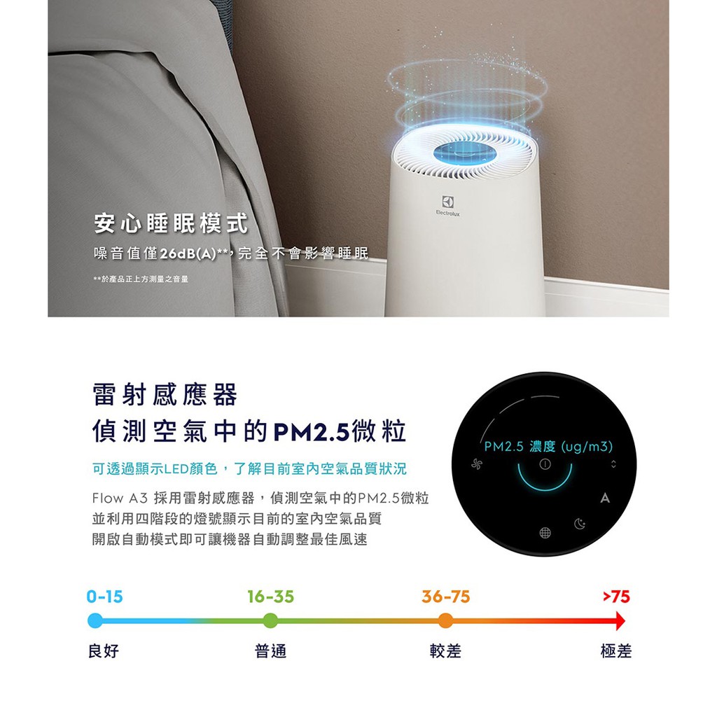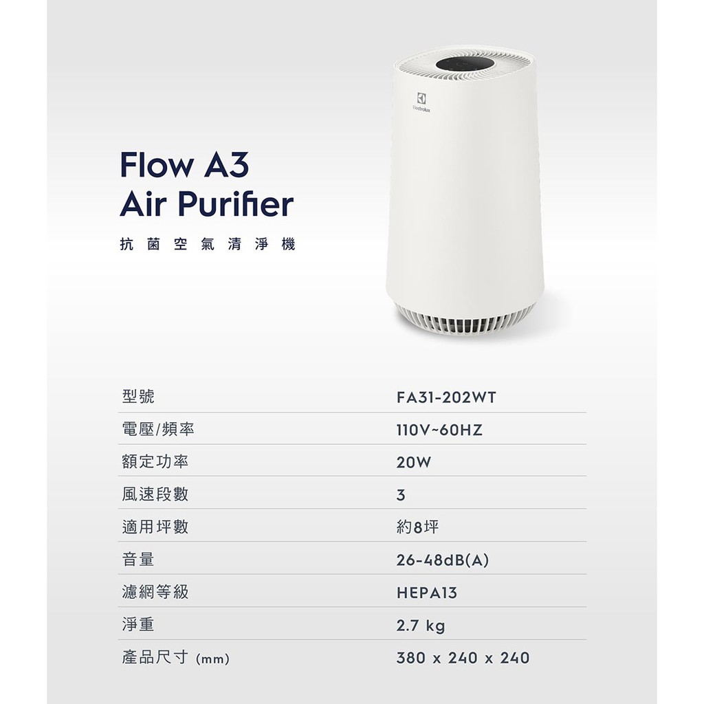 Electrolux Flow A3 Air Purifier 抗菌空氣清淨機-原廠公司貨2年保固 FA31(淺灰色)FA31-202GY|甜甜價不挑色|(峽灣藍) – FA31-202BL|(霞光粉)-FA31-202Pk|買一送一再送濾網*1|FA31-202GN極光綠|FA31-202W冰河白Air TreatmentSL 3C數位生活館