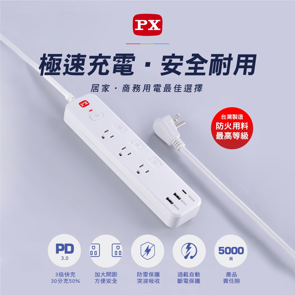 PX大通 PEC-343P6W 30W 4切3座6尺 快充 PD / QC USB電源延長線 台灣製造 防火 過載保護PEC-343P6WElectric Sockets & Extension CordsPX大通電子官方UHD 8K HDMI影音旗艦館