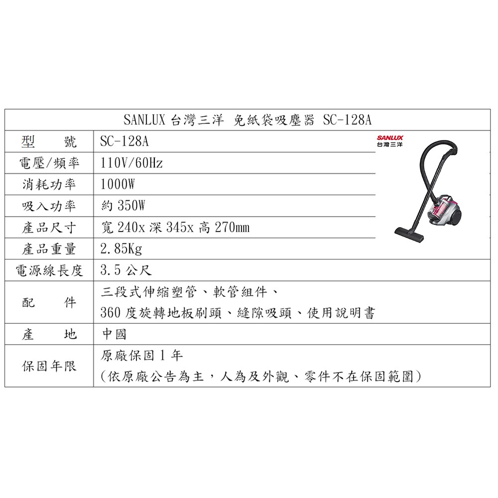 SANLUX 台灣三洋 HEPA無塵袋真空旋風吸塵器 SC-128ASANLUX 台灣三洋 HEPA無塵袋真空旋風吸塵器 SC-128AVacuum Cleaners & Floor Care AppliancesSANLUX台灣三洋館