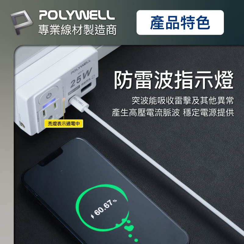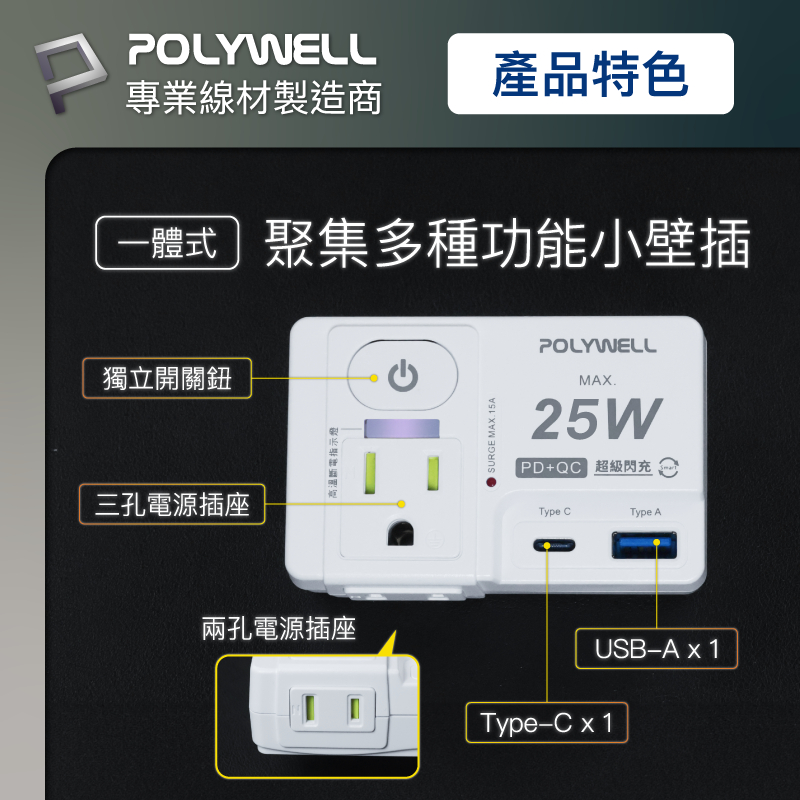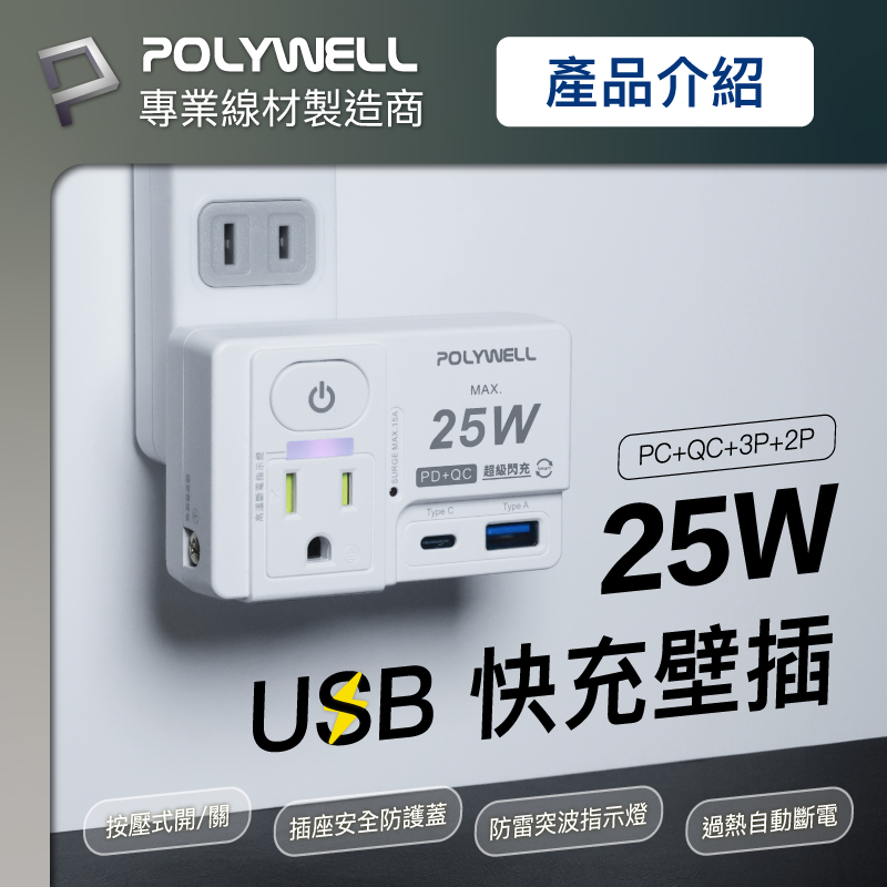 POLYWELL USB快充電源壁插 1切2座 25W快充 USB Type-C 過載保護 自動斷電 寶利威爾 台灣現貨USB快充電源壁插 1切2座 25W快充|USB快充電源壁插 1切2座 20W快充Electric Sockets & Extension CordsPOLYWELL寶利威爾官方旗艦店